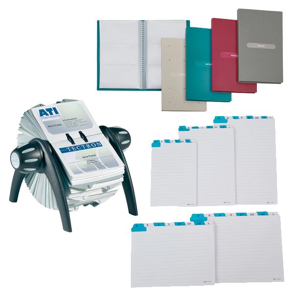 Portabiglietti da visita dotato di intercalari a tasti alfabetici e 20 buste con finitura antiriflesso. Intercalari e buste sono rimovibili e riposizionabili. Ogni busta ha 16 posti (8 per lato) da 85x55 mm adatti a contenere biglietti da visita. Chiusura con elastico per una perfetta conservazione delle buste e per un trasporto sicuro. Formato esterno: 26,5x25 cm. Refill buste cod. 85234E.