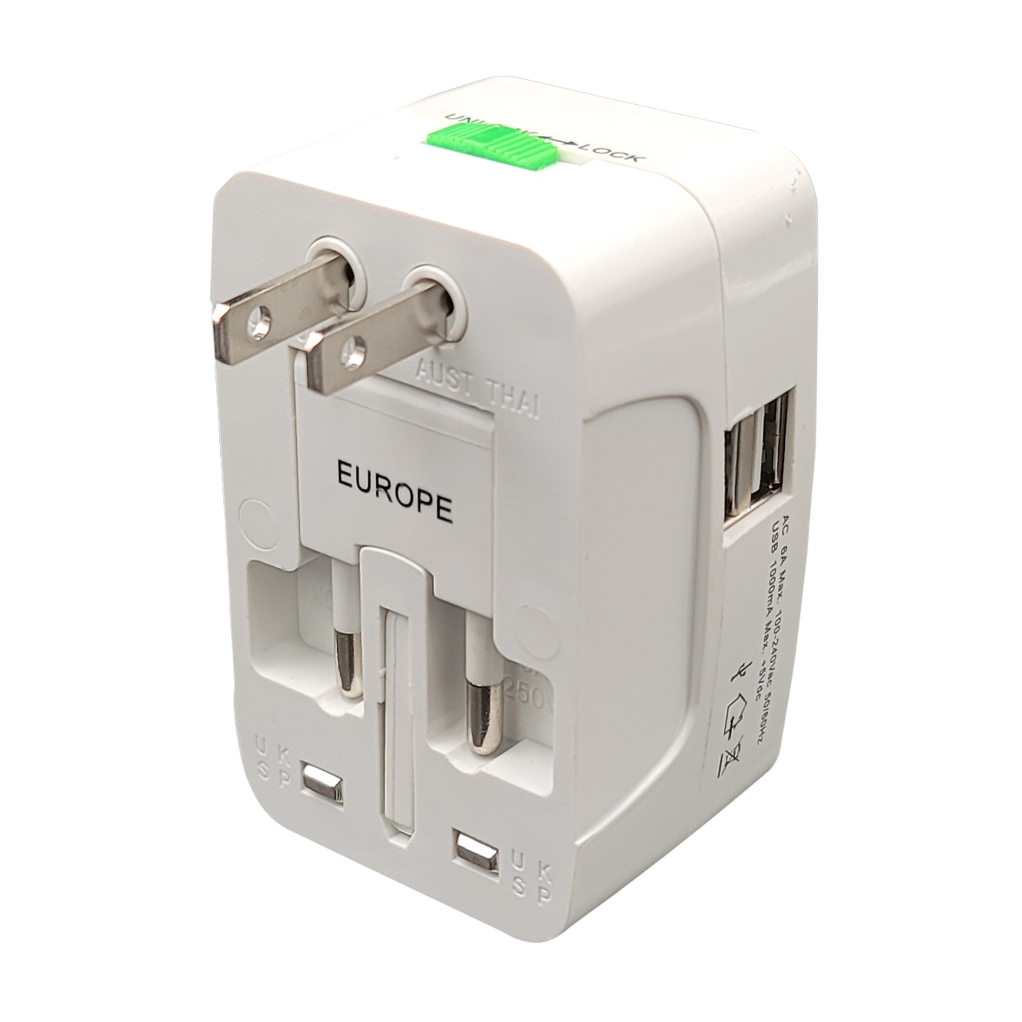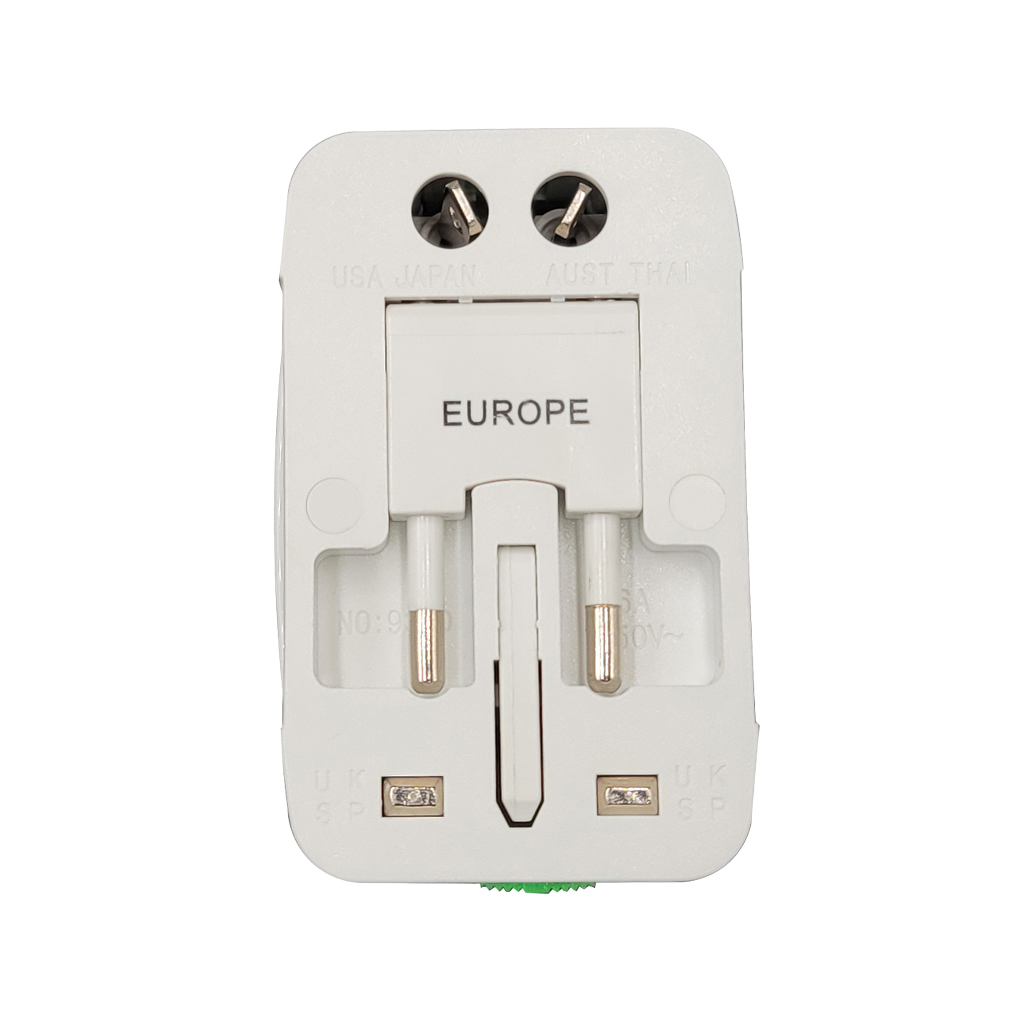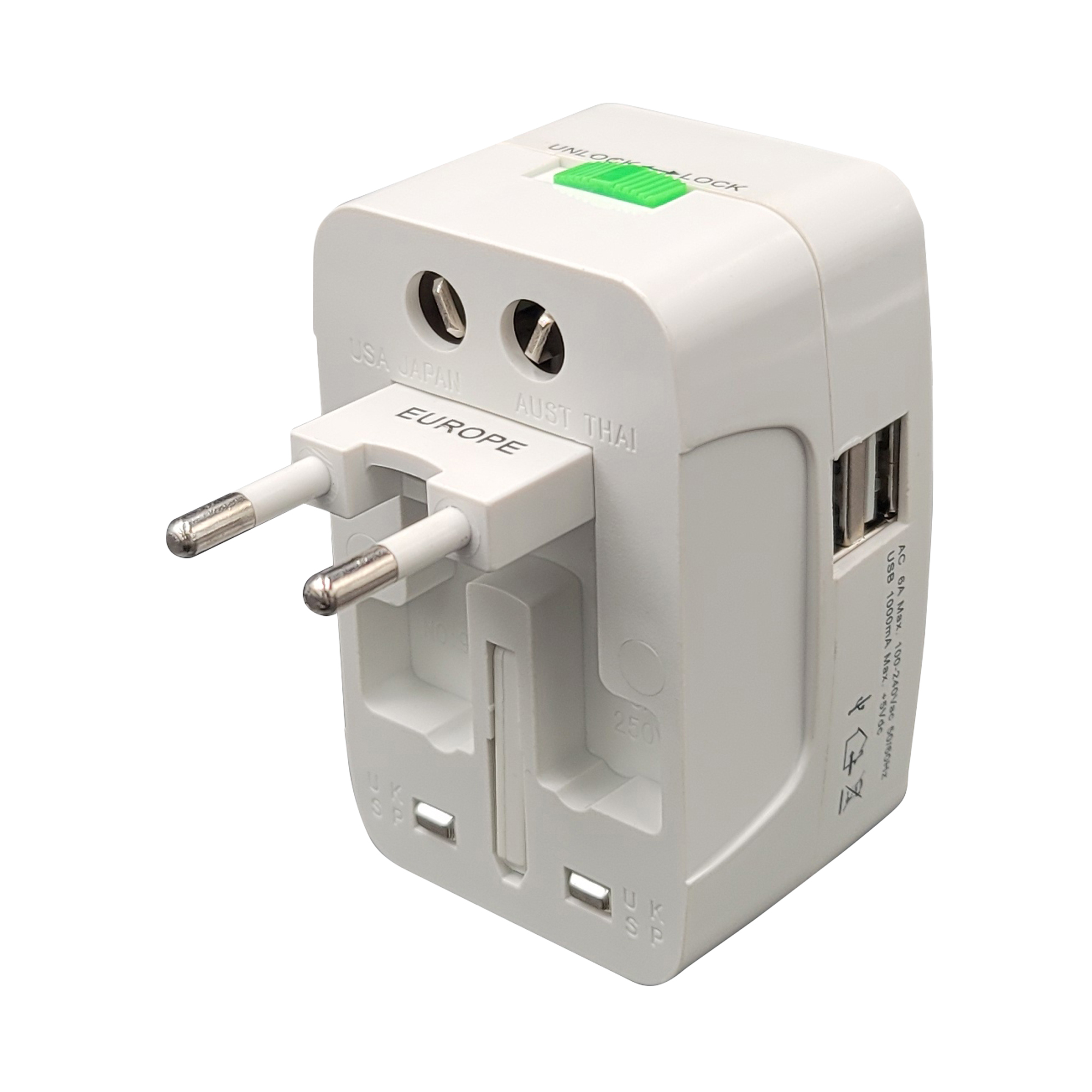 Adattatore da viaggio per spine e prese di tipo europeo, inglese e americano con 2 USB.