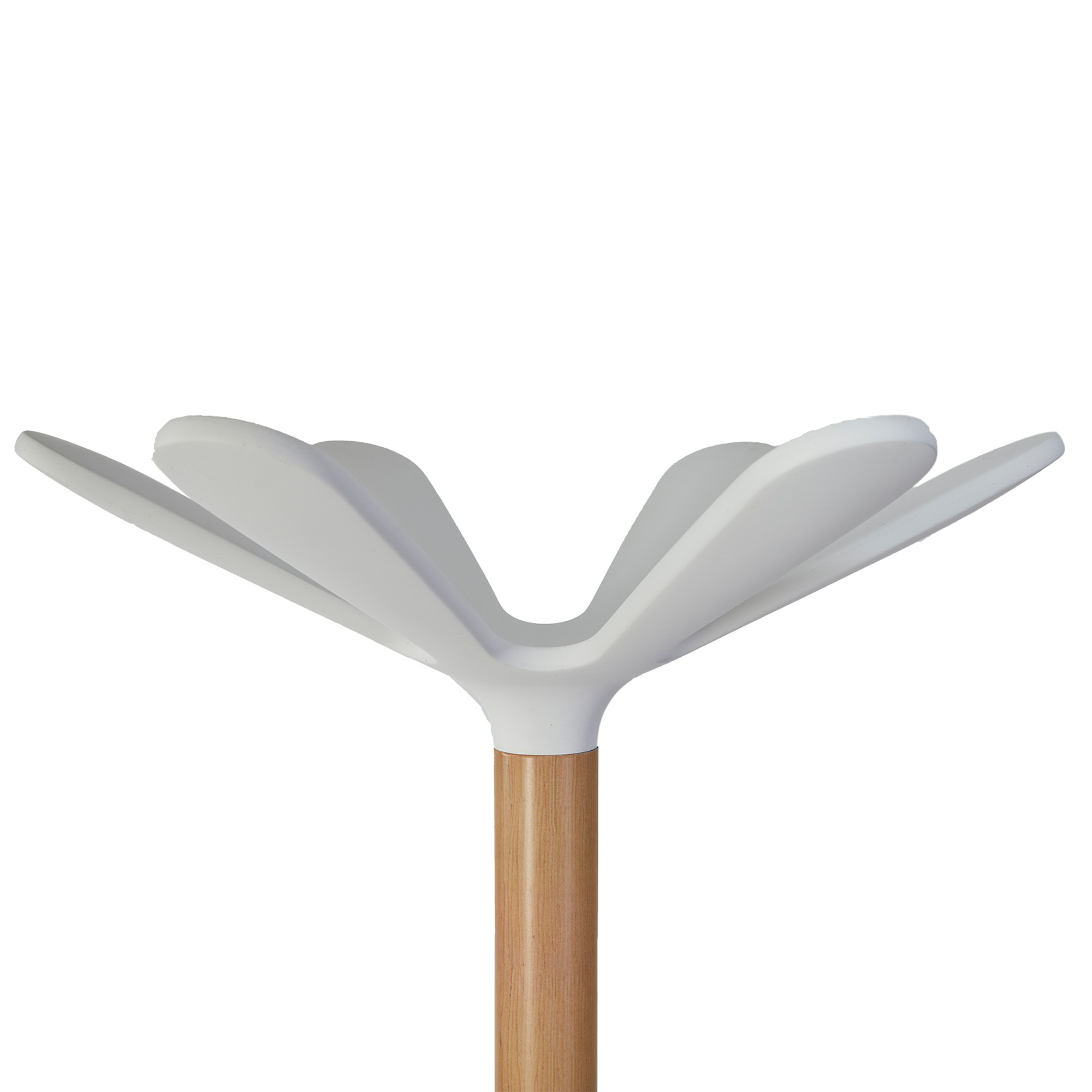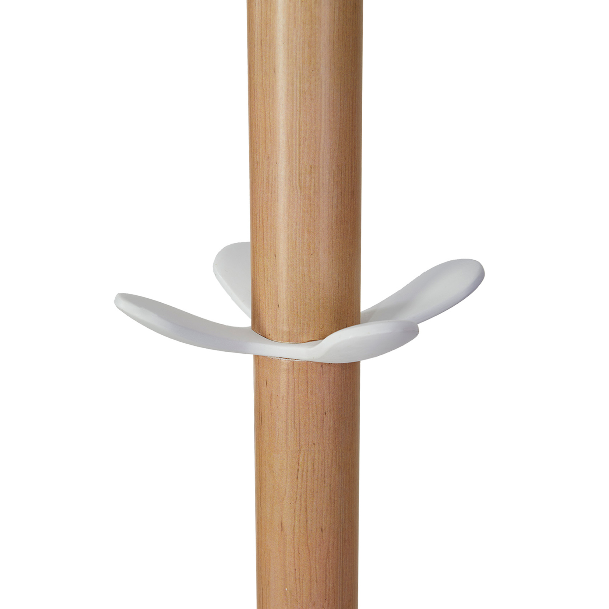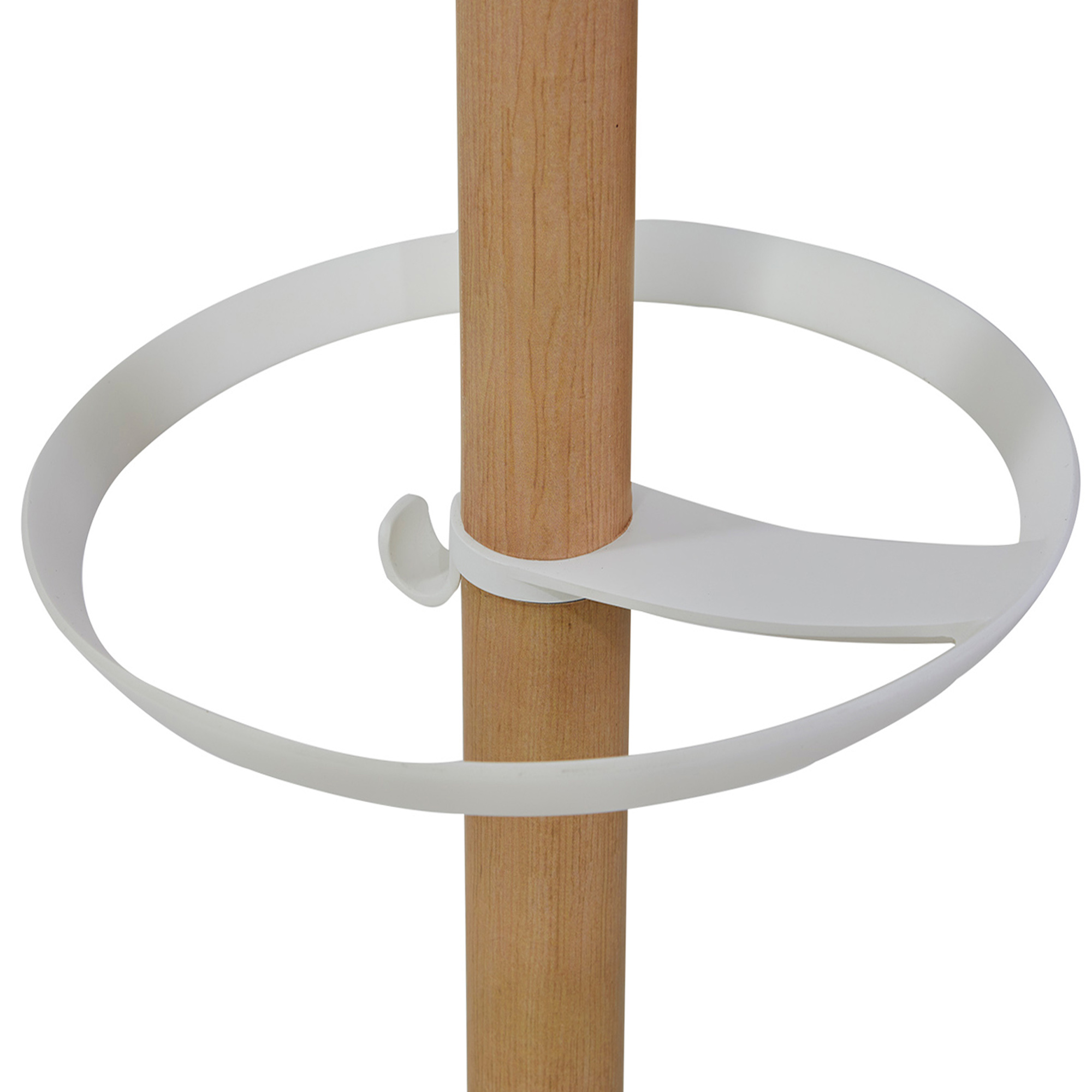 Appendiabiti elegante in legno chiaro e ABS con base appesantita raccogli gocce. Dotato di 6 supporti abito in ABS + 4 mini supporti per gli accessori e portaombrelli. Dimensioni: base Ø35 - altezza 175cm. Tubo : Ø 38mm.