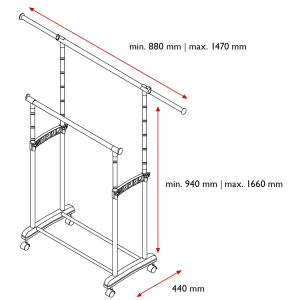 Appendiabiti multiuso facile da trasportare e comodo da usare. Con ampia base di appoggio e tubi estensibili per aumentarne la capacità. Può essere usato come appendiabiti dopo la stiratura, come stendibiancheria per capi ingombranti o in alternativa al classico armadio. Si assembla facilmente senza l'uso di utensili. Dotato di ruote e griglia porta scatole. 2 barre. Misure: base cm 88 estensibile fino a cm 147, altezza cm 94 estensibile fino a cm 166.