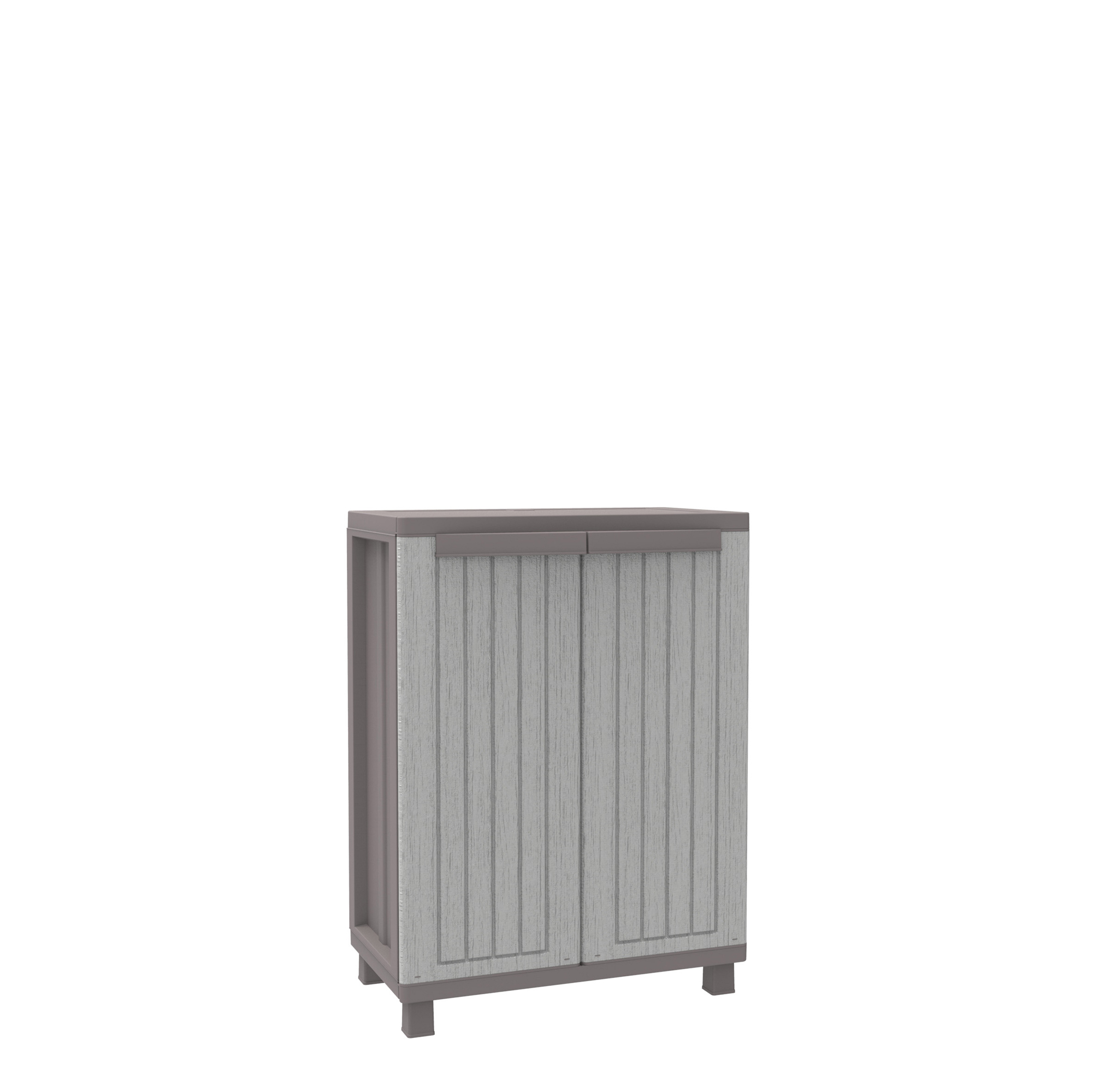Linea di armadi modulari con robusta struttura in PPL ed elegente finitura legno color tortora. Gli armadi hanno ante apribili a 180° e ripiani regolabili. Piedini rialzati e predispozizione per il lucchetto. Adatto sia per ambienti interni che esterni. Armadietto a 2 ante con 1 ripiano regolabile. L68 x P37,5 x H91,5cm.