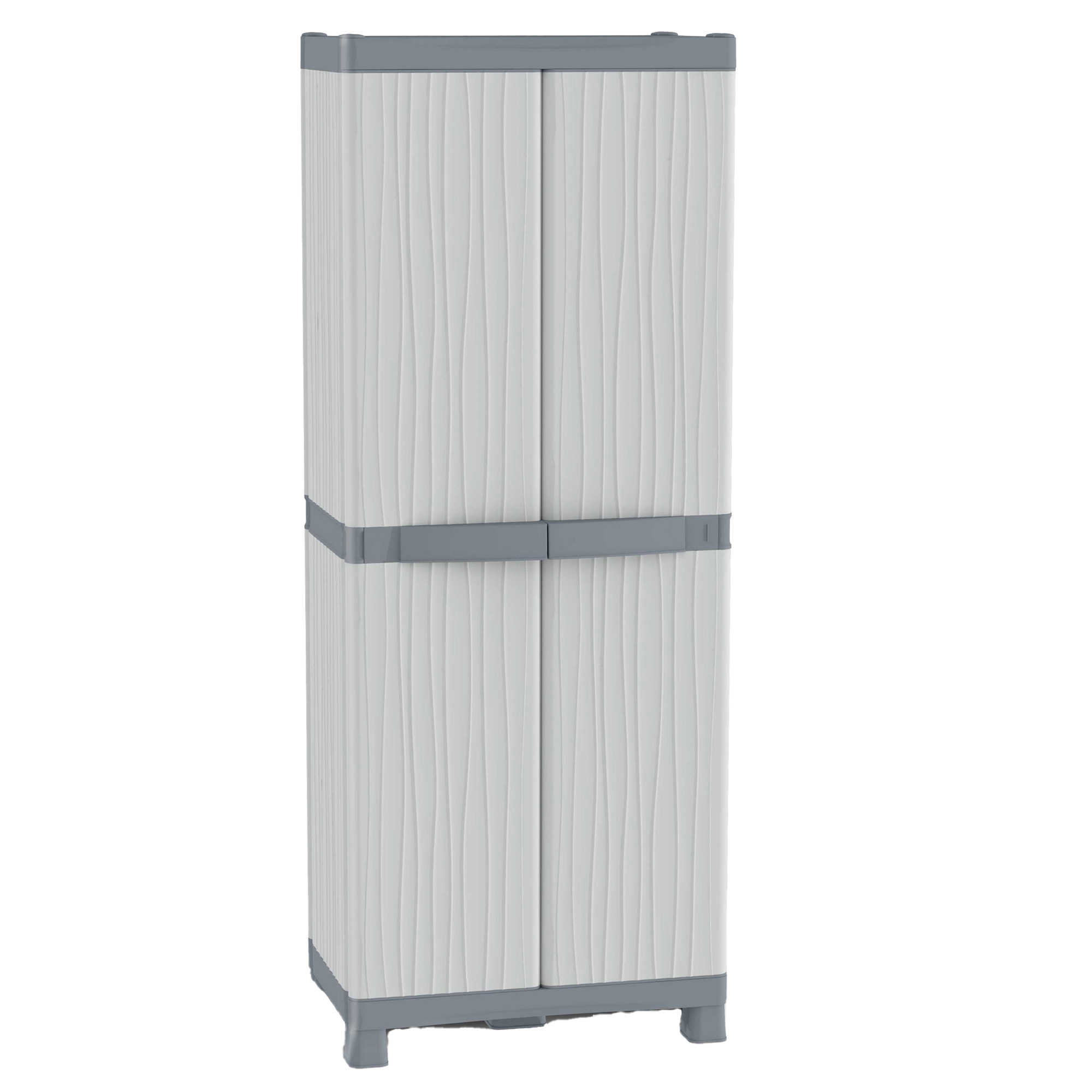 Armadio a due ante , 4 ripiani regolabili (portata 30kg), 2 vaschette. Possibilità di chiusura con lucchetto (non incluso). dimensioni (lxpxh): 70x43,8cm - h181,8cm. Domino wave Þ un sistema modulare componibile con struttura solida in polipropilene, stabile e duratura nel tempo. I ripiani sono interamente regolabili in altezza tramite l'apposita cremagliera. Chiusura lock system che assicura il mantenimento della chiusura delle ante anche contro vento e pioggia.