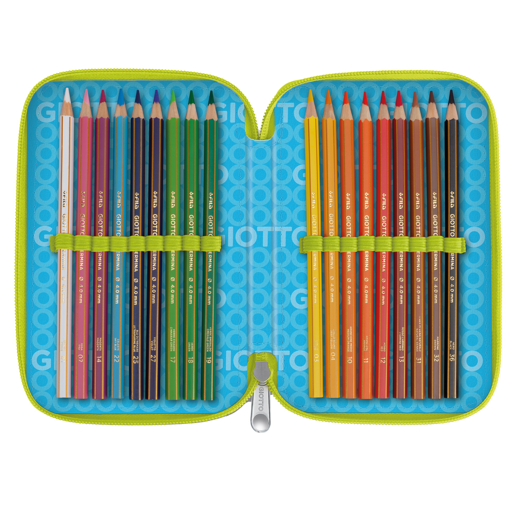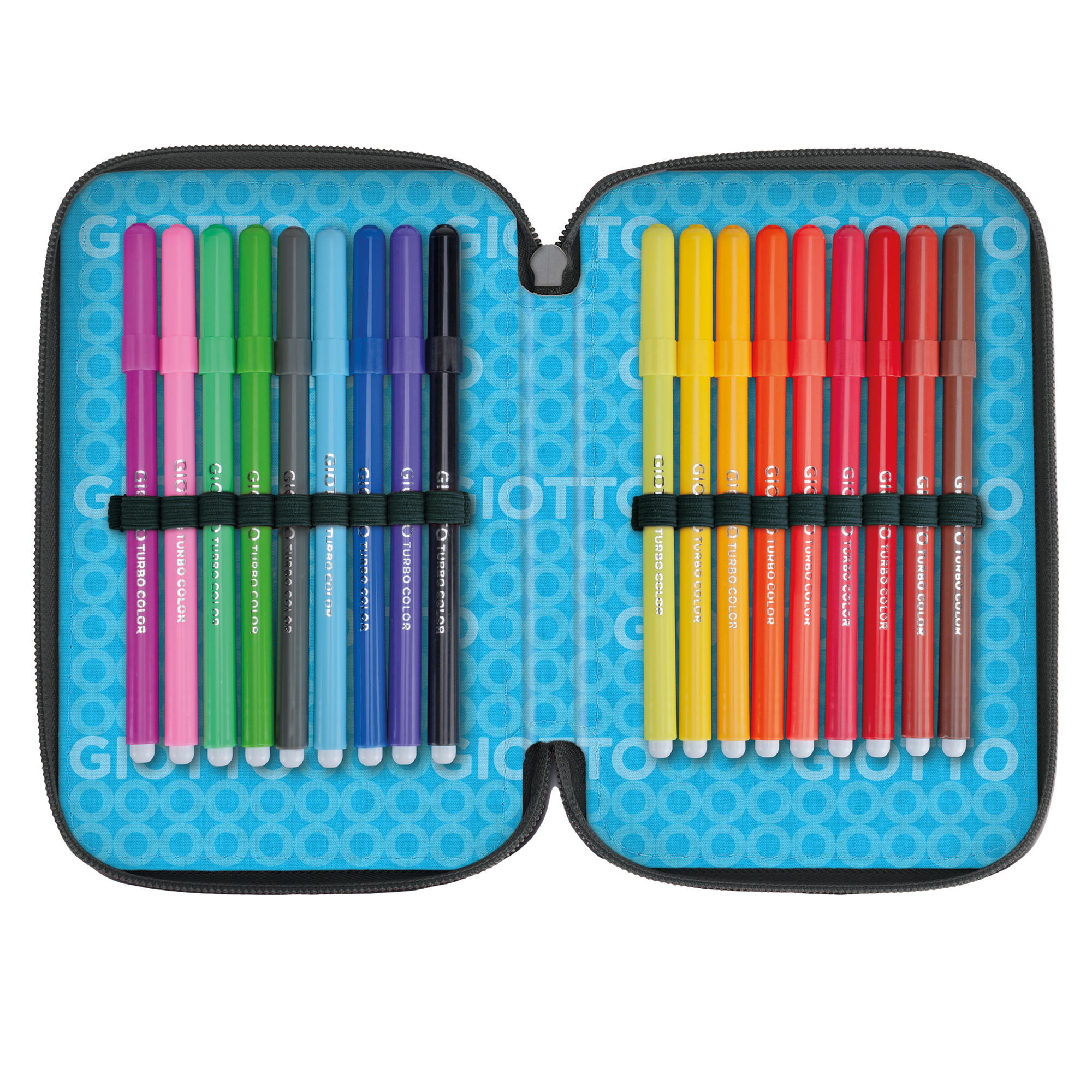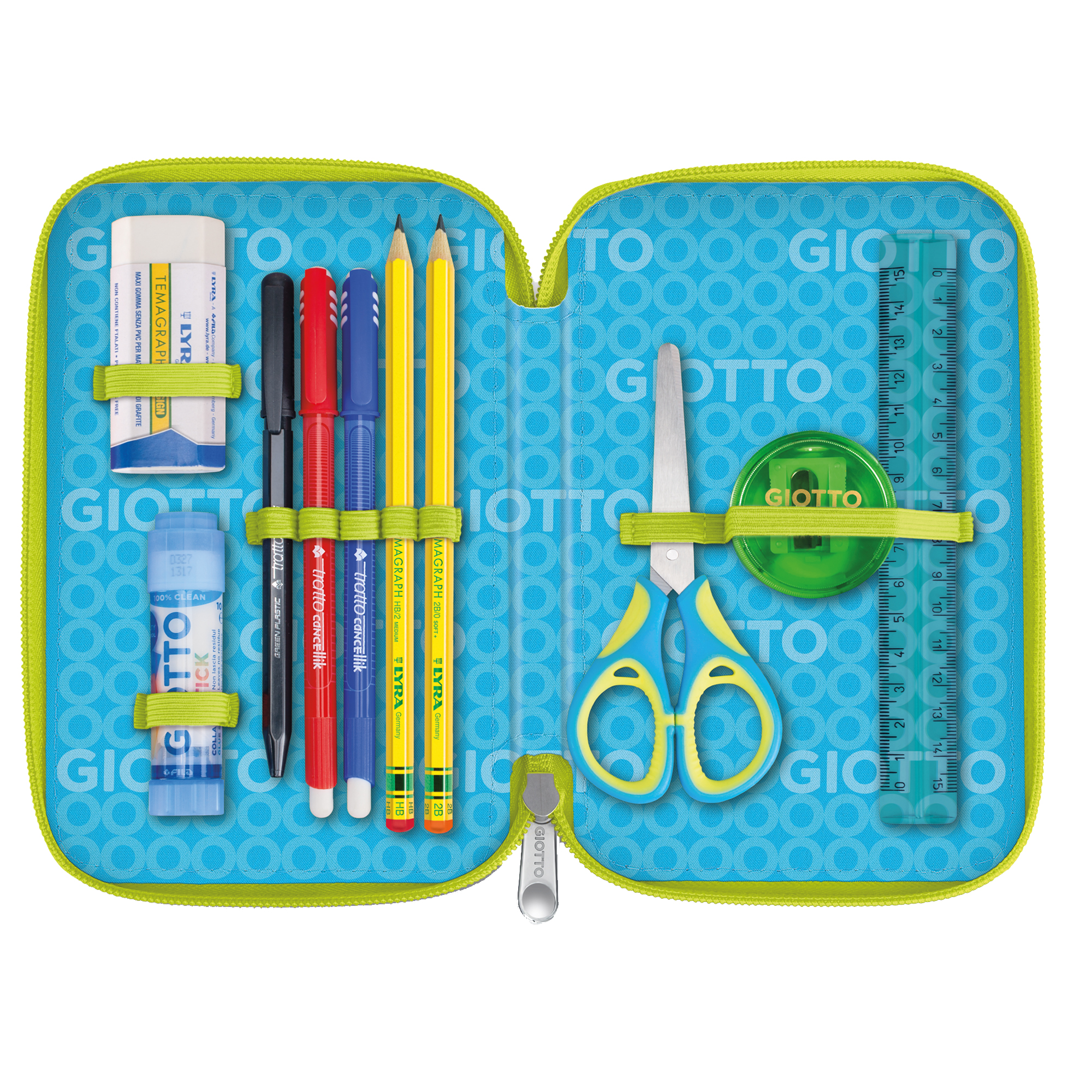 Astuccio a 3 scomparti in poliestere 900D impermeabile dotato di cerniera in metallo. Contenuto: 1 colla stick da 10gr, 1 righello 15cm, 1 maxi gomma No-Sign, 1 temperamatite c/serbatoio, 1 forbice, penna Tratto Cancellik rosso e blu, 1 penna Tratto Uno Green nero, 1 matita HB, 1 Matita 2B, 18 pennarelli Turbo Color e 18 pastelli Supermina 4mm.