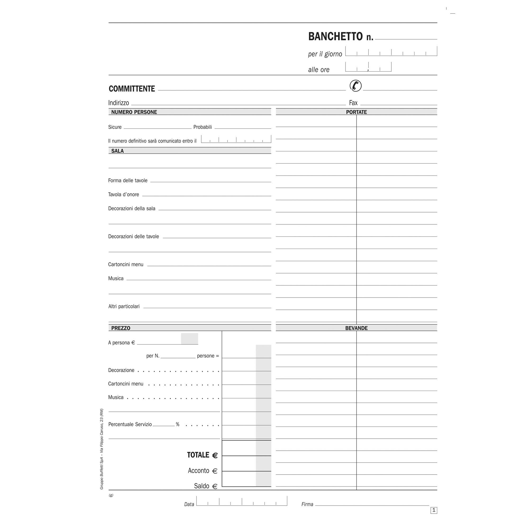 Preventivi e ordinativi per banchetti, blocco di 50/50 copie autoricalcanti. Formato 29,7x21,5cm.