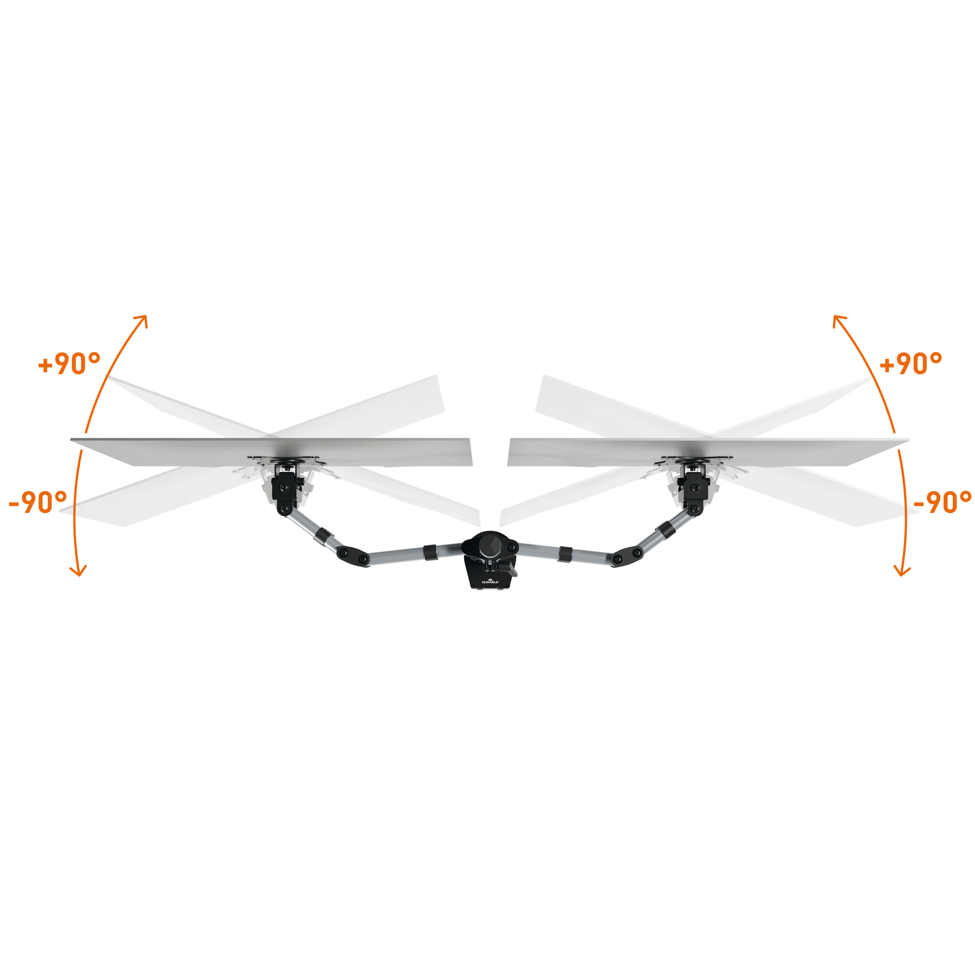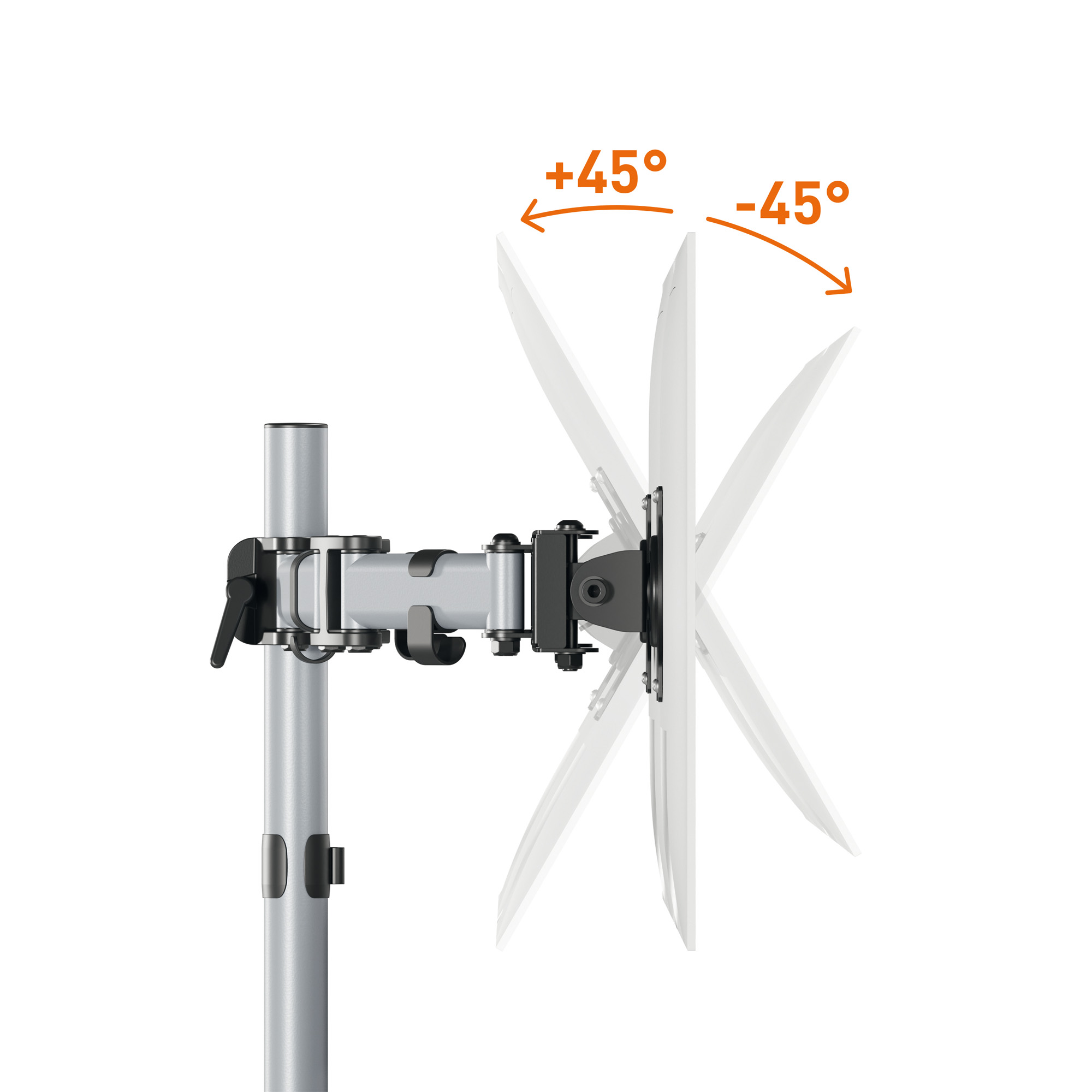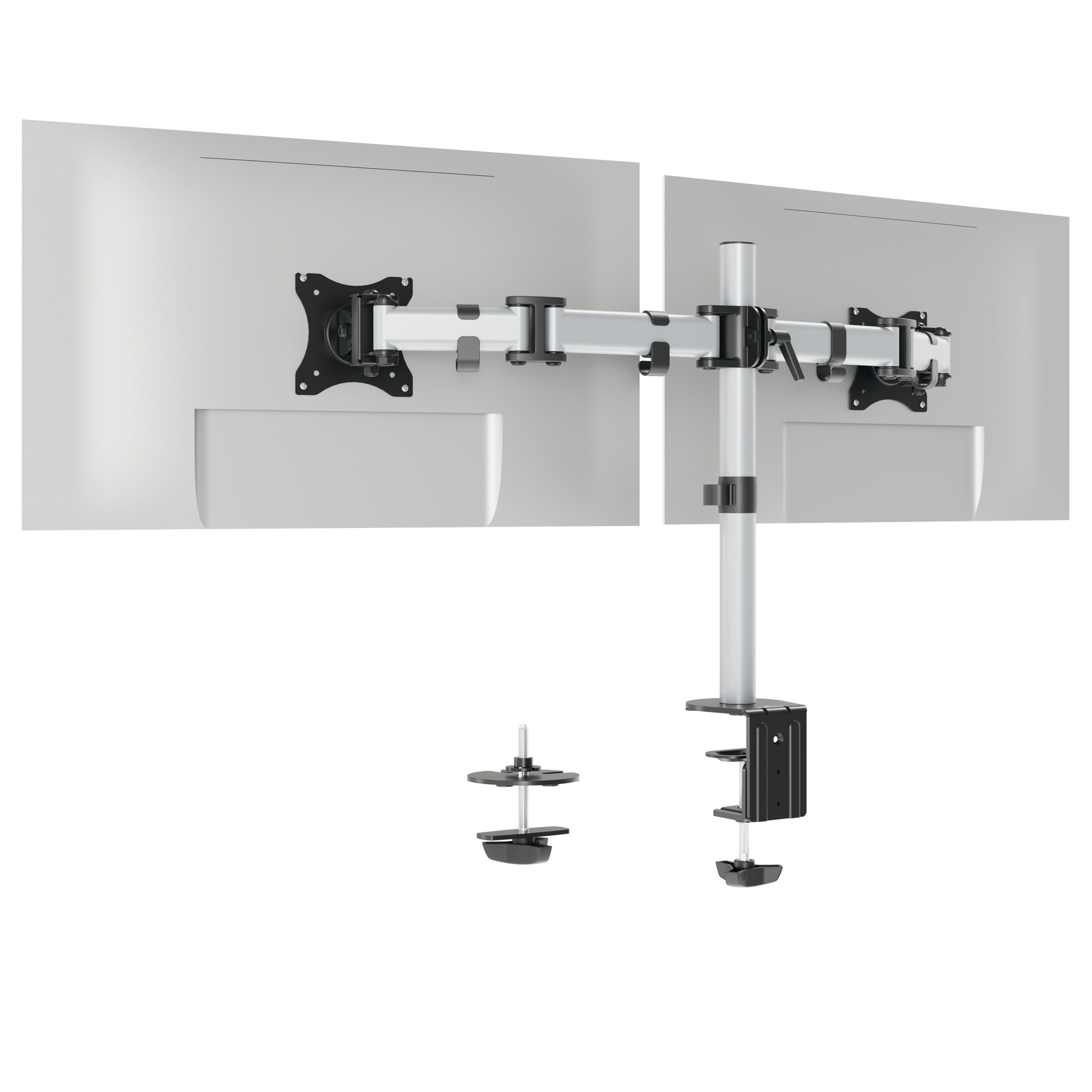 Braccio porta monitor per 2 monitor standard fino a 27" e fino a 8 kg. Fissaggio tramite morsetto o perno per foro passacavo (entrambi inclusi nella confezione). Altezza, inclinazione e orientamento del monitor regolabili facilmente e individualmente per un lavoro ergonomico. Supporto universale VESA (75 x 75 mm o 100 x 100 mm). Gestione dei cavi: il cavo del monitor è guidato lungo il supporto da 3 clip passacavo, proteggendolo così dalla rottura. Il monitor può essere ruotato di 360° per lavorare in modalità verticale o orizzontale. I tre snodi presenti sul braccio lo estendibile fino a 40 cm e permettono di direzionare di 180° (+90°/-90°). Il monitor può essere inclinato di 90° (+45°/-45°). L'altezza dello schermo puà essere regolata lungo la colonna da 44 cm. Fissaggio con morsetto: per scrivanie da 10-88 mmFissaggio con perno per foro passacavo: per scrivanie da 10-75 mm. Materiali: acciaio, plastica e alluminio.