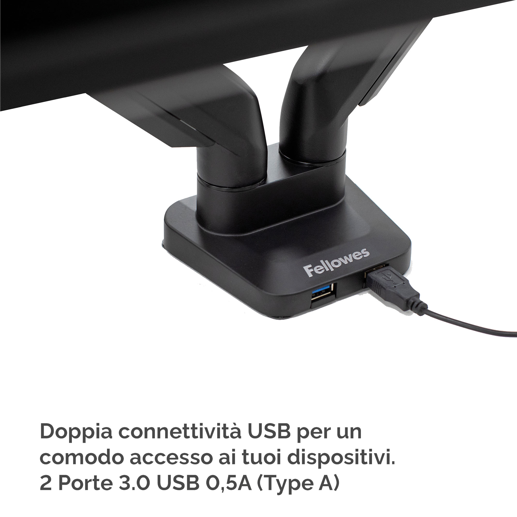 Bracci monitor completamente regolabili con innovativa tecnologia a molle a gas per spostamenti e regolazioni senza sforzi del monitor. Il sistema ordinacavi tiene la scrivania in ordine, e la porta USB alla base permette di connettere fino a due dispositivi. Facile montaggio a morsa o tramite foro e ganascia. Varie configurazioni di schermi disponibili. Compatibilità VESA - 75x75/100x100. Per scrivanie di spessore compreso tra 19 e 120mm. Peso max monitor: 18kg. F.to max monitor: 27"/68.58cm. Rotazione: 360°. Inclinazione: +85/15°.