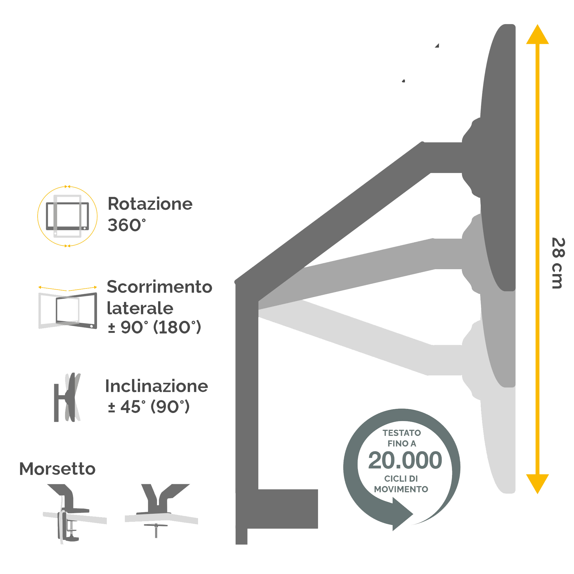Bracci monitor completamente regolabili con innovativa tecnologia a molle a gas per spostamenti e regolazioni senza sforzi del monitor. Il sistema ordinacavi tiene la scrivania in ordine, e la porta USB alla base permette di connettere fino a due dispositivi. Facile montaggio a morsa o tramite foro e ganascia. Varie configurazioni di schermi disponibili. Compatibilità VESA - 75x75/100x100. Per scrivanie di spessore compreso tra 19 e 120mm. Peso max monitor: 9kg. F.to max monitor: 30"/76,2cm. Rotazione: 360°. Inclinazione: +85/15°.