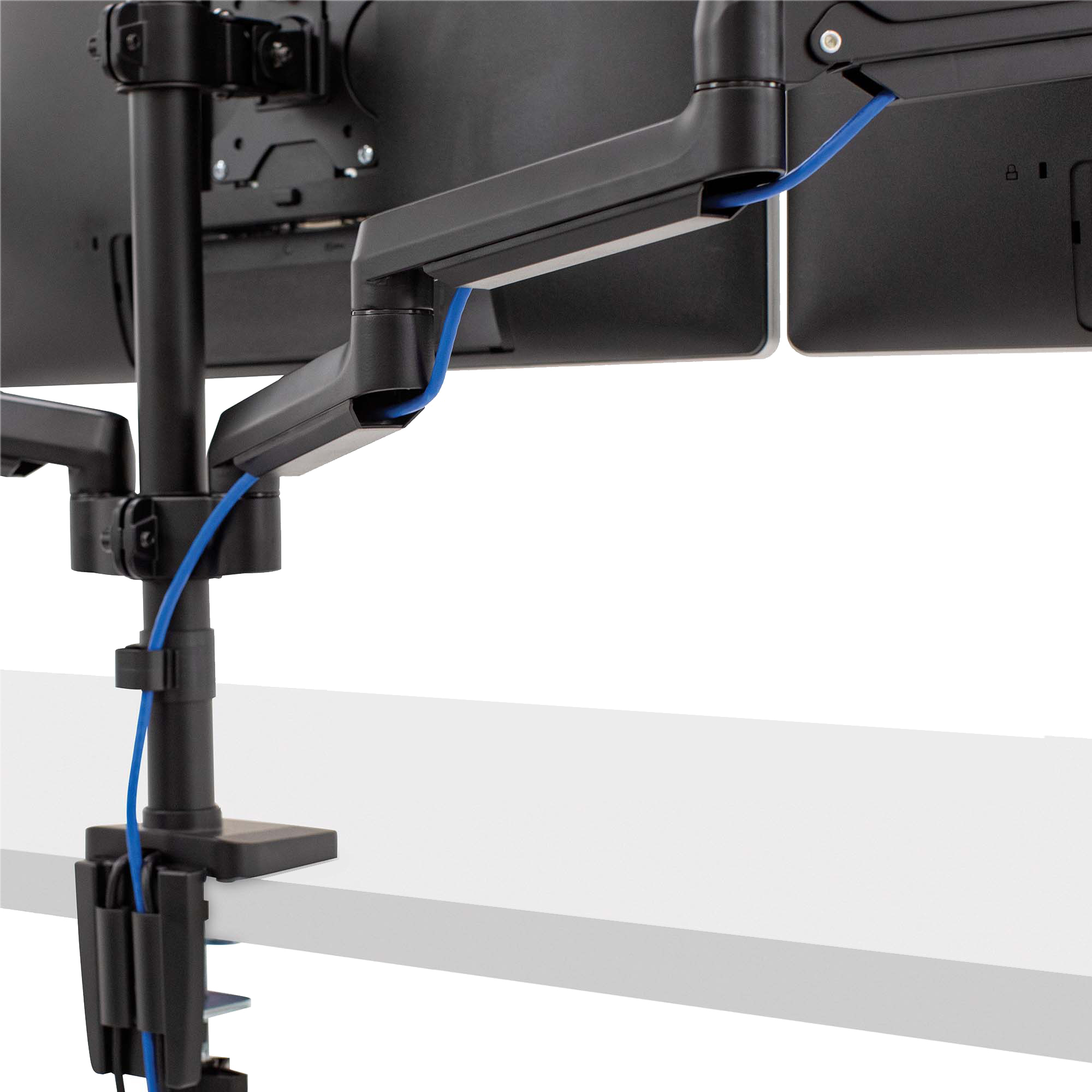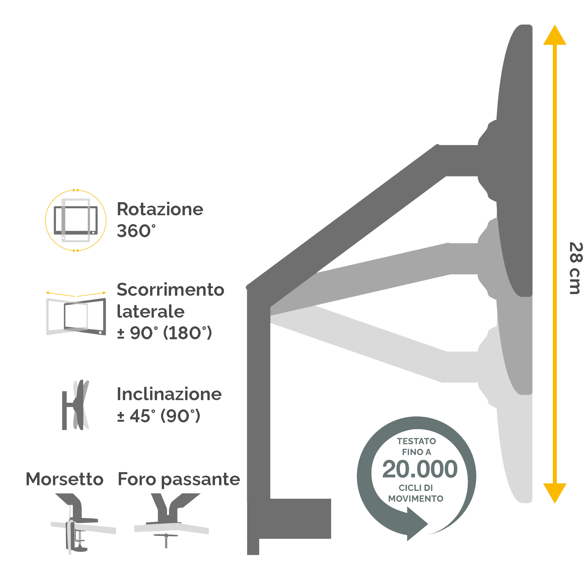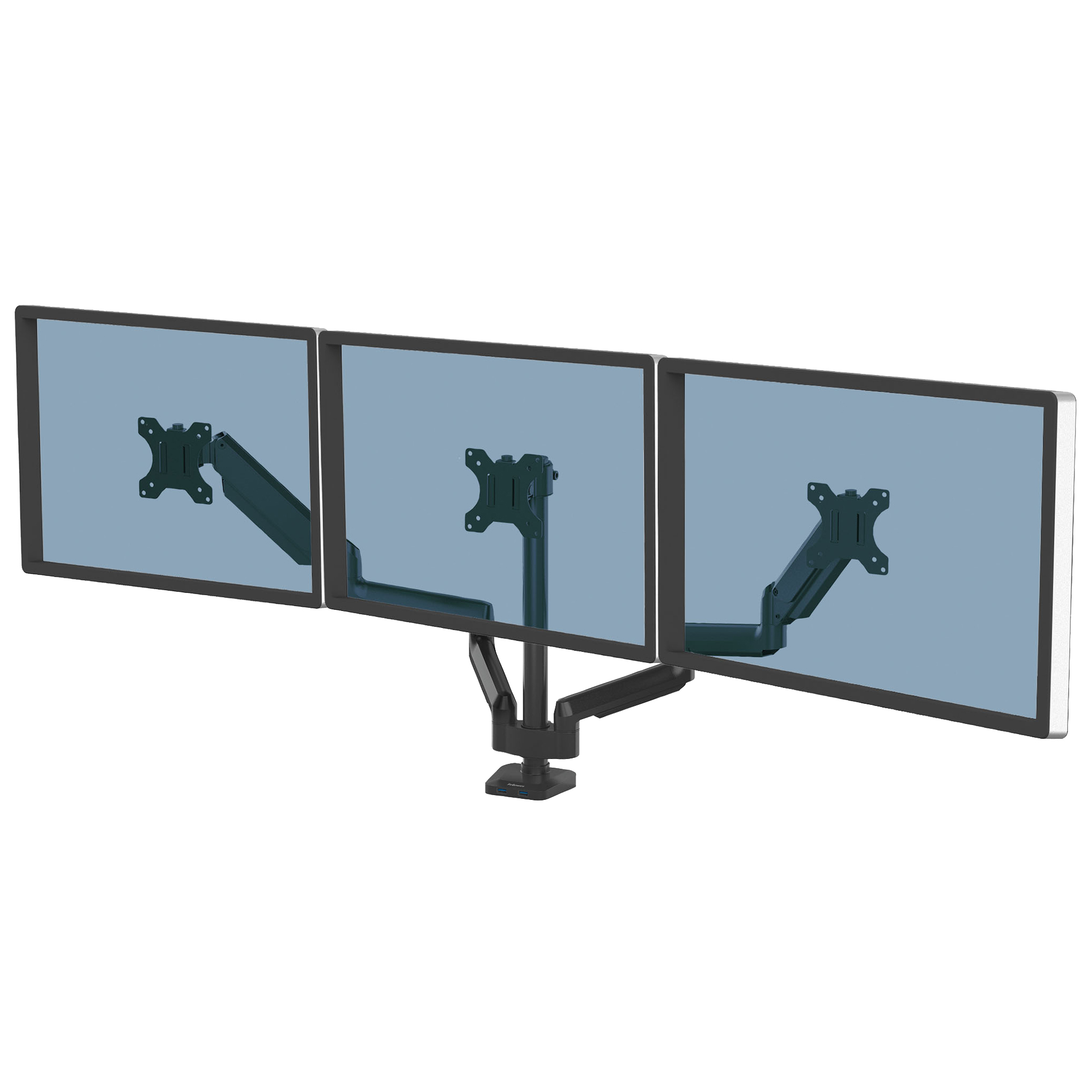 Bracci monitor completamente regolabili con innovativa tecnologia a molle a gas per spostamenti e regolazioni senza sforzi del monitor. Il sistema ordinacavi tiene la scrivania in ordine, e la porta USB alla base permette di connettere fino a due dispositivi. Facile montaggio a morsa o tramite foro e ganascia. Varie configurazioni di schermi disponibili. Compatibilità VESA - 75x75/100x100. Per scrivanie di spessore compreso tra 19 e 120mm. Peso max monitor: 27kg. F.to max monitor: 30"/76,2cm. Rotazione: 360°. Inclinazione: +85/15°.