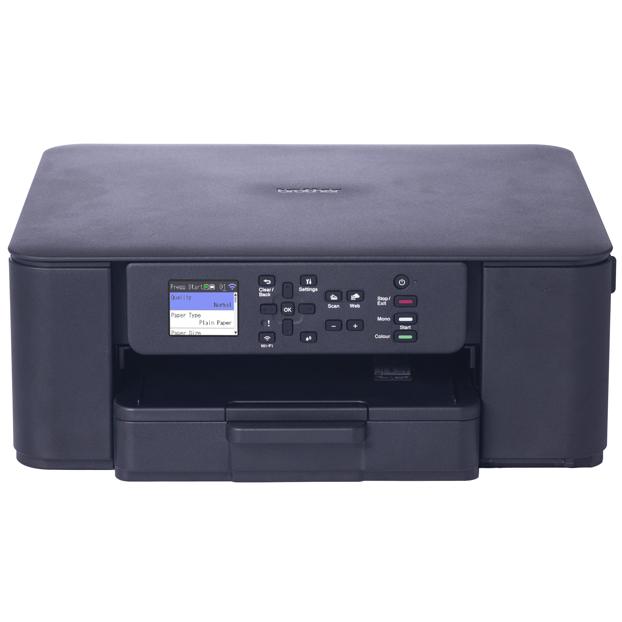 Multifunzione 3-in-1 inkjet a colori. Stampa fino a 16 ipm. Duplex automatico per la stampa. Cassetto da 150 fogli e slot di alimentazione manuale. Display da 4,5 cm (1.8"). WiFI 5GHz e USB. Stampa e scansione da PC o da app. Inbox da 200 pagine nero e per ogni colore.