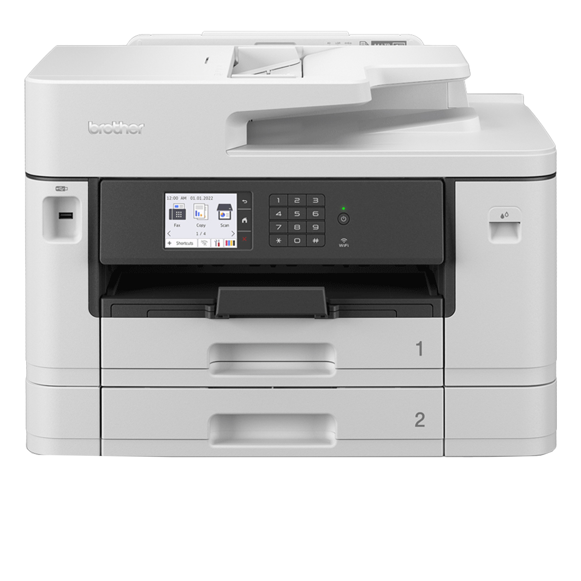 Stampante multifunzione inkjet A3 professionale con rete wireless. Può stampare fino al formato A3 mentre può copiare e scansionare fino al formato A4. Stampa automatica rapida su 2 facciate A4, ampio touchscreen a colori da 8,8cm e opzione di scansione A4 su 2 lati. Soddisfa le esigenze dei piccoli uffici e dei gruppi di lavoro aziendali più esigenti. La funzionalità A3 consente di produrre una varietà di documenti a colori in A3 e A4, senza problemi, con stampe di alta qualità, velocità di stampa elevate e costi di gestione ridotti. Il dispositivo multifunzione offre funzionalità di stampa, copia, scansione e fax. Stampa dalla postazione di lavoro, in una sala riunioni o dal dispositivo mobile con connettività wireless. • Funzionalità di stampa (fino a A3), copia, scansione e fax. • Velocità di stampa fino a 28 ipm in bianco e nero e a colori • Stampa/scansione automatica A4 su 2 lati • Connettività cablata e wireless | compatibile con dispositivi mobili – scarica l'app: Brother Mobile Connect • Touch screen LCD a 8,8cm colori • Vassoio carta standard da 250 fogli, più 250 vassoio inferiore aggiuntivo | vassoio multifunzione da 100 fogli | ADF da 50 fogli