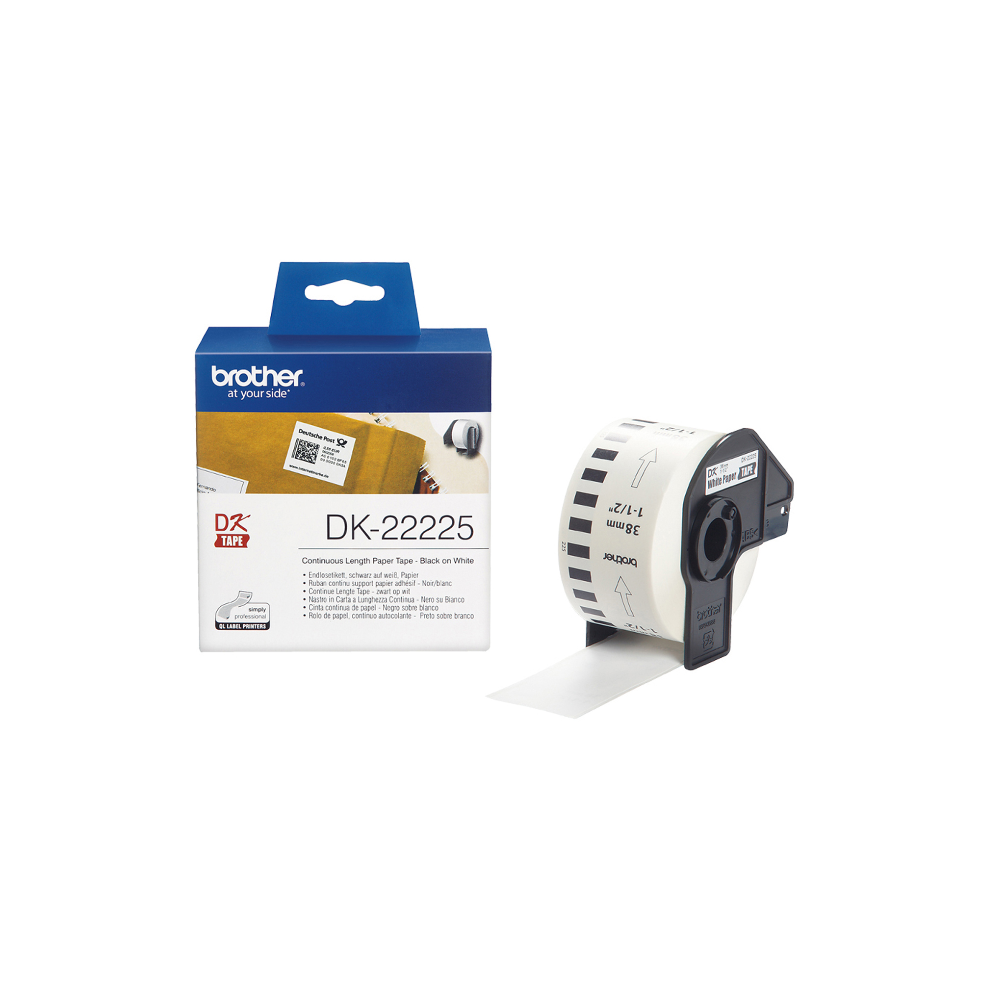 Info sui prodotti "Brother - Rotolo etichetta continua - carta adesiva - Nero/Bianco - 38mm x 30,48mt - DK-22225"