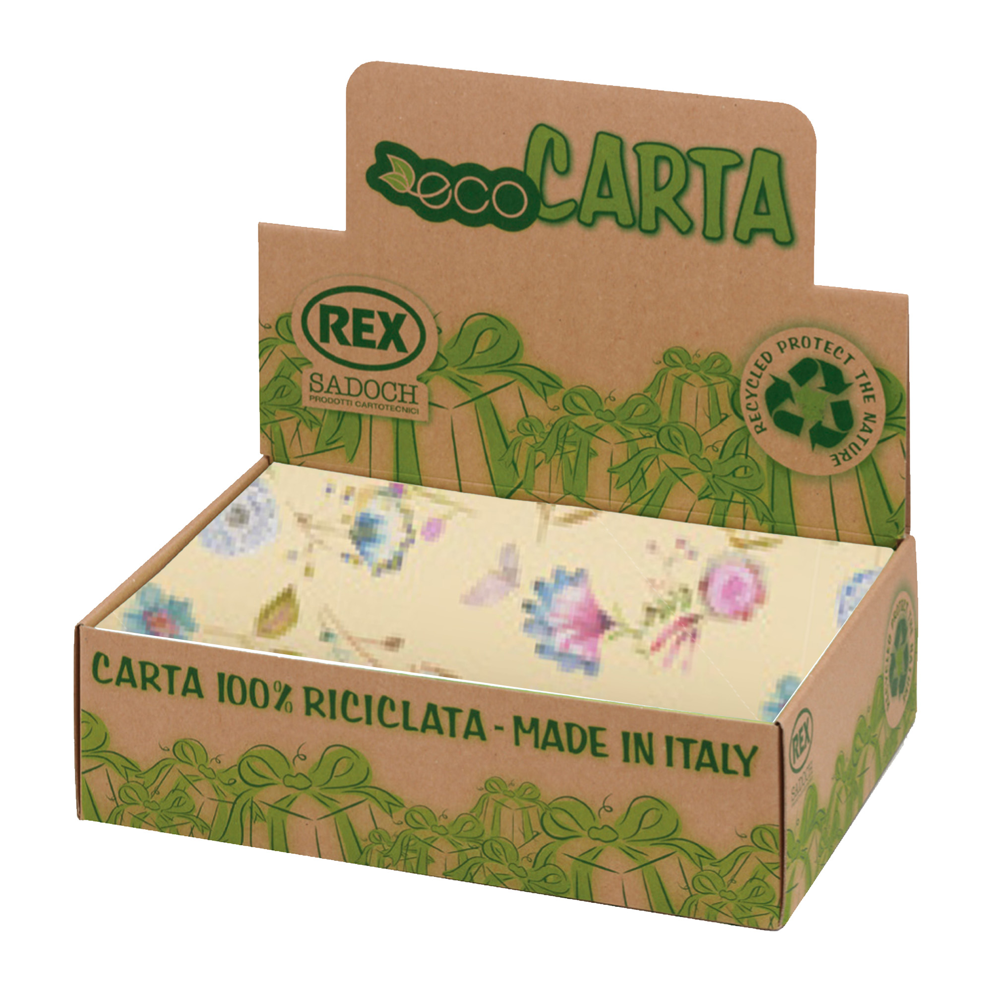 Carta da regalo 65gr/m2 riciclata al 100%. 6 fantasie assortite.