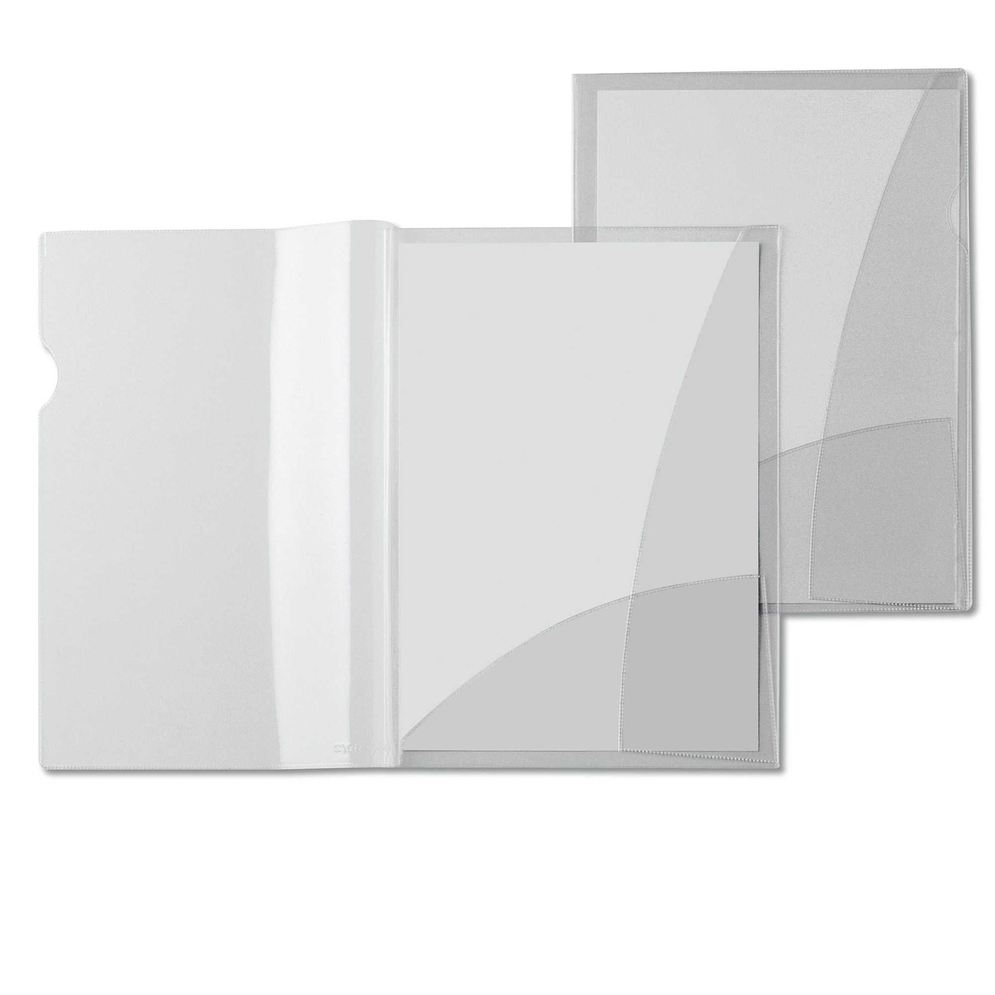 Confezione da 5 cartelline in PVC trasparente cristallo. Una tasca verticale e una tasca apribile sul secondo quadrante. Formato 21x29,7cm.