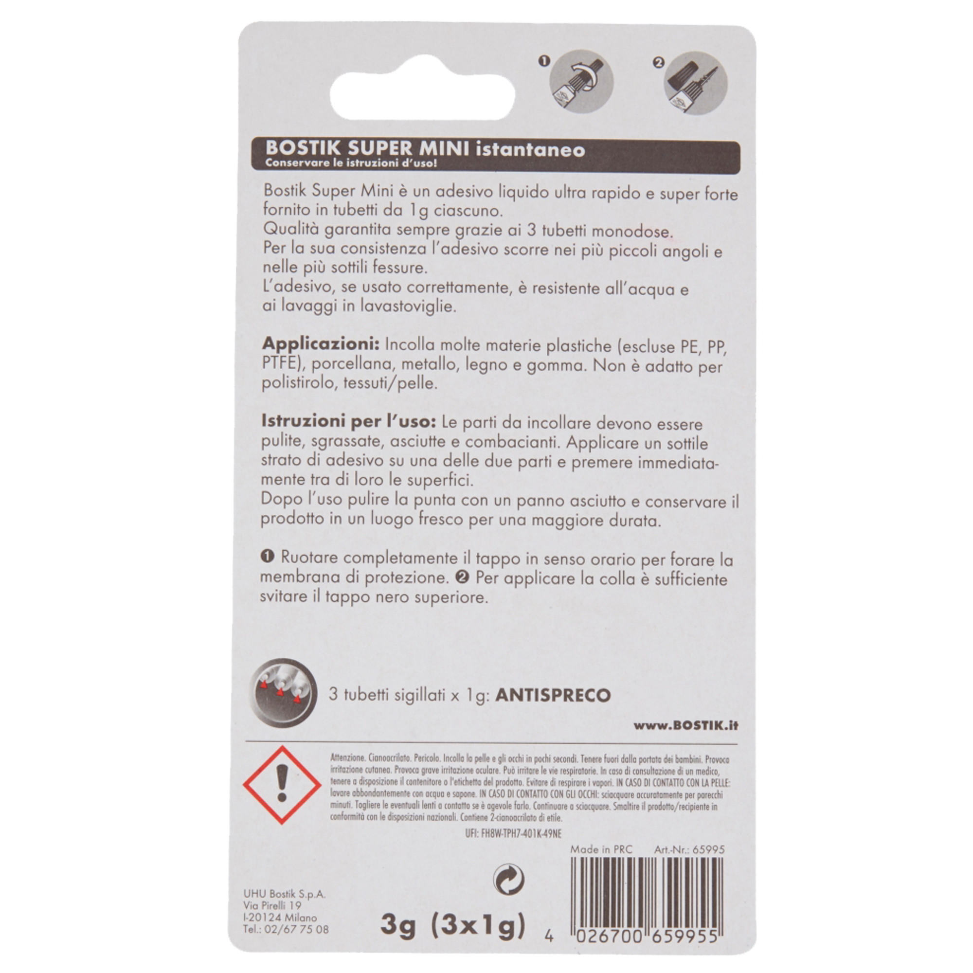 Adesivo universale istantaneo e super forte. Trasparente. Ideale per ceramica, porcellana, metallo, materie plastiche (ad es. PVC, ABS), cuoio, gomma, legno e cartone. Solo parzialmente adeguato su vetro e non indicato per PE, PP, resine siliconiche e gomma (Si), PTFE, Teflon®, styrofoam, indumenti in pelle e tessuto. 3 confezioni monodose e antispreco da 1g, ideali per riparazioni ed incollaggi di piccole dimensioni, raggiungendo anche giunti e fessure molto piccoli. Apertura facilitata grazie al tappo “AVVITA & APRI”. Resistente all’acqua e ai lavaggi in lavastoviglie.