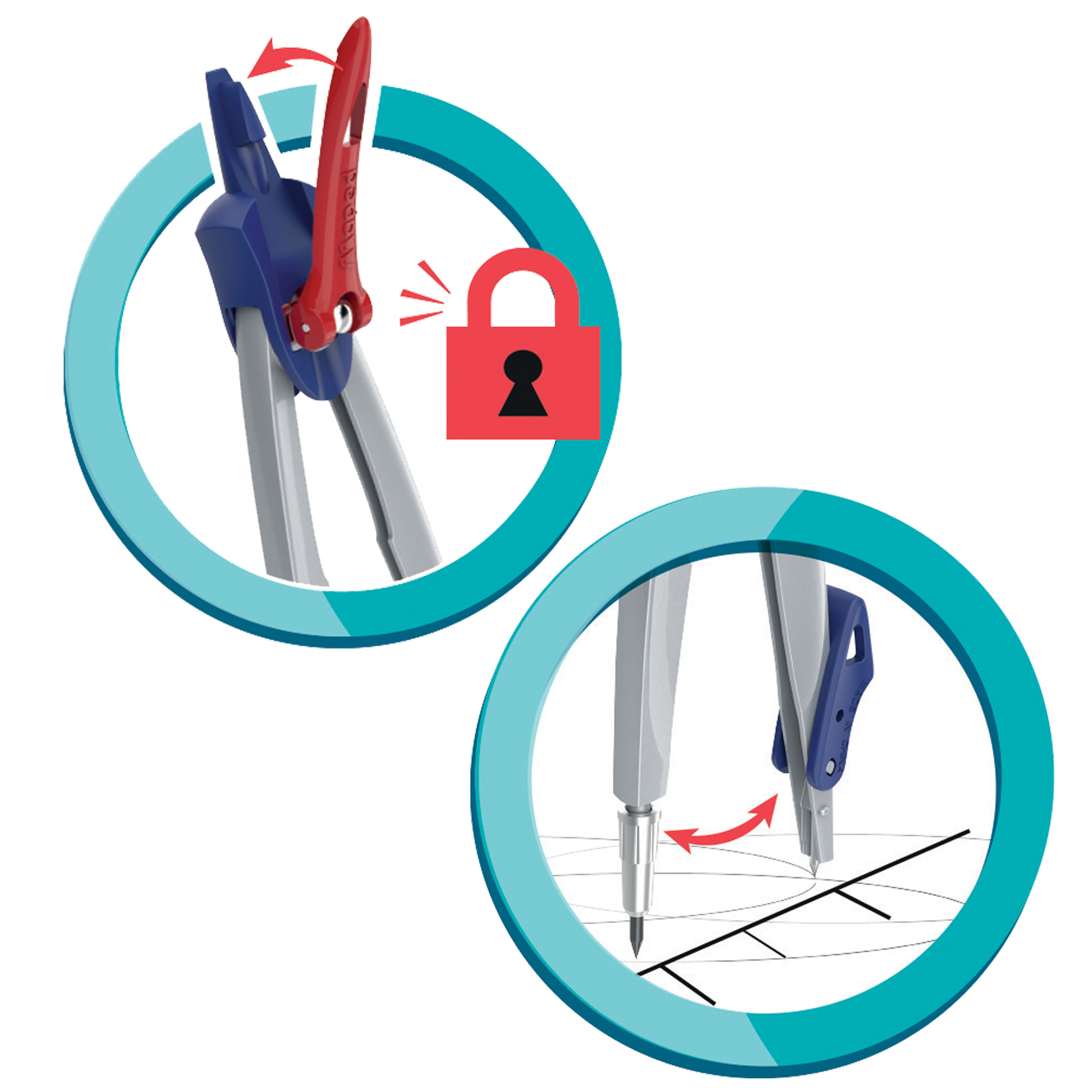 SET DA 3 PEZZI (1 COMPASSO STOP SYSTEM, 1 ADATTATORE UNIVERSALE, 1 ASTUCCIO MINE). PARTICOLARITA' DEL COMPASSO E' LA LEVA BREVETTATA PER IL BLOCCO DELLE ASTE.