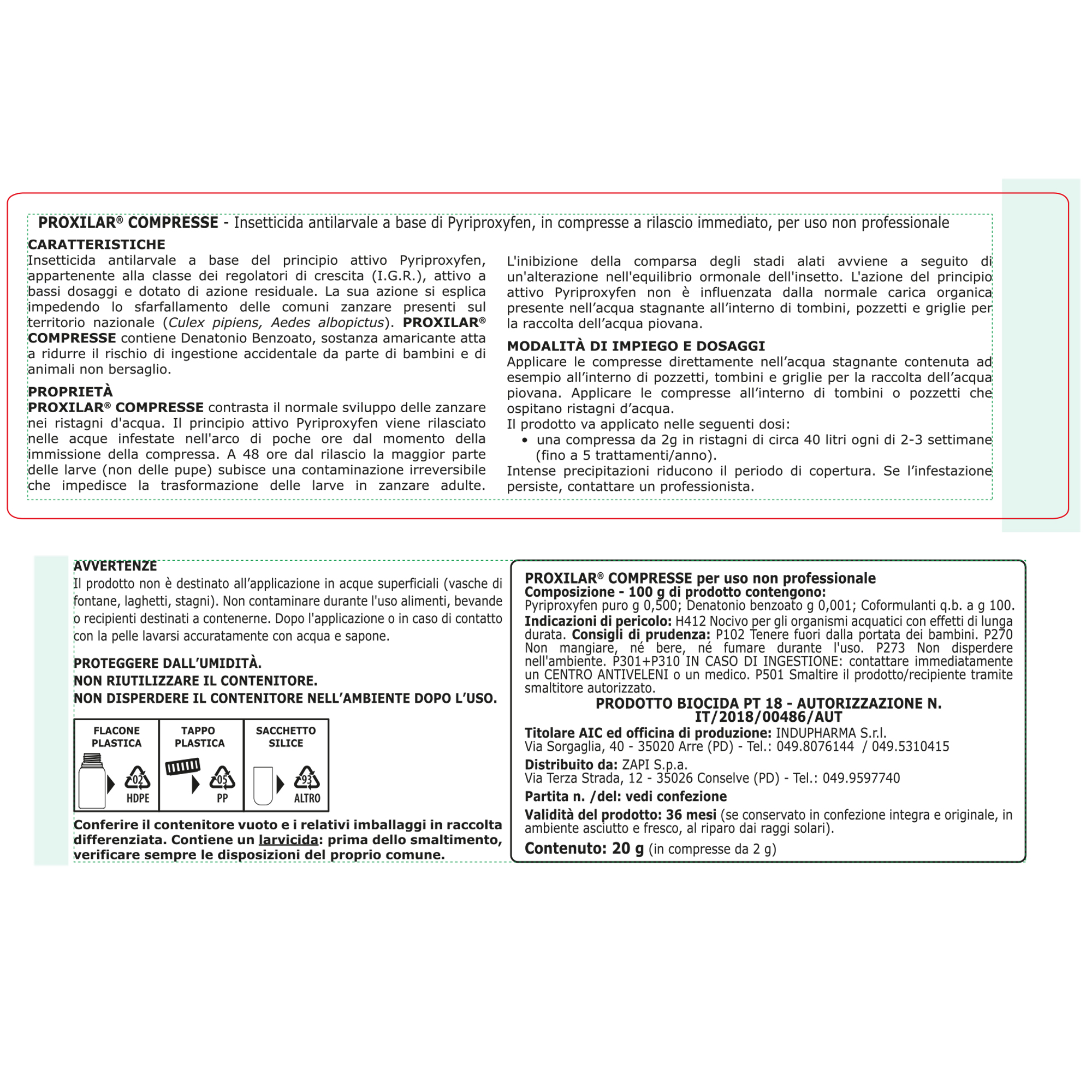 Insetticida antilarvale in barattolo da 10 compresse a base del principio attivo Pyriproxyfen, appartenente alla classe dei regolatori di crescita (I.G.R.), attivo a bassi dosaggi e dotato di azione residuale. Attivo per 2-3 settimane. Contrasta il normale sviluppo delle zanzare nei ristagni d’acqua. Il principio attivo viene rilasciato nelle acque infestate nell’arco di poche ore dal momento dell’immissione della compressa e non è influenzato dalla normale carica organica presente nell’acqua stagnante all’interno di tombini, pozzetti e griglie per la raccolta dell’acqua piovana. Composizione: Pyriproxyfen puro 0,500 %, Denatonio benzoato 0,001%. Registrazione: PT18 AUTORIZZAZIONE N. IT/2018/00486/AUT PRODOTTO BIOCIDA. Nocivo per gli organismi acquatici con effetti di lunga durata.