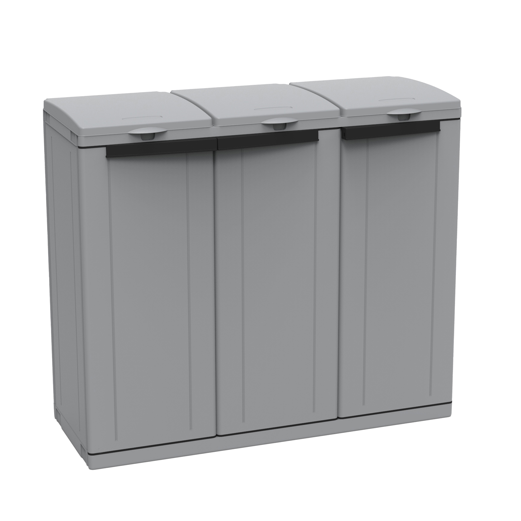 Armadietto a tre ante ideato per la raccolta differenziata dei rifiuti. Dotato di due porta-sacco da 110 lt ciascuno chiudibili con coperchio. L'apertura delle ante permette una facile estrazione frontale dei sacchi pieni. Adatto per utilizzo in ambiente esterno . Da montare. Dimensioni: 102x39x88,7cm - 110+110+110lt.