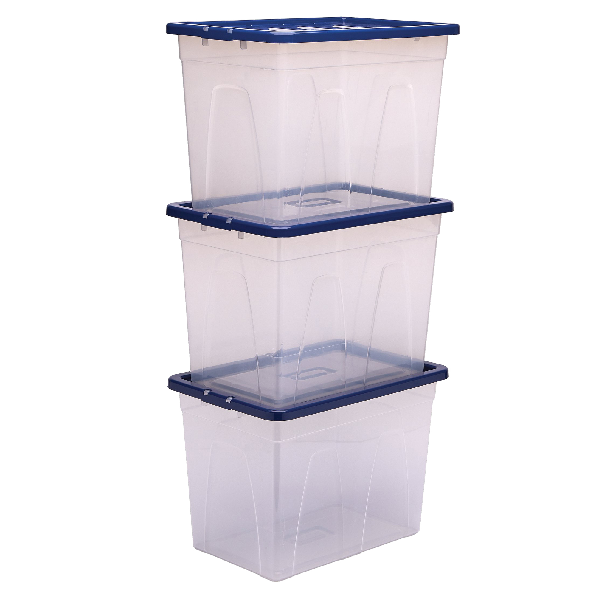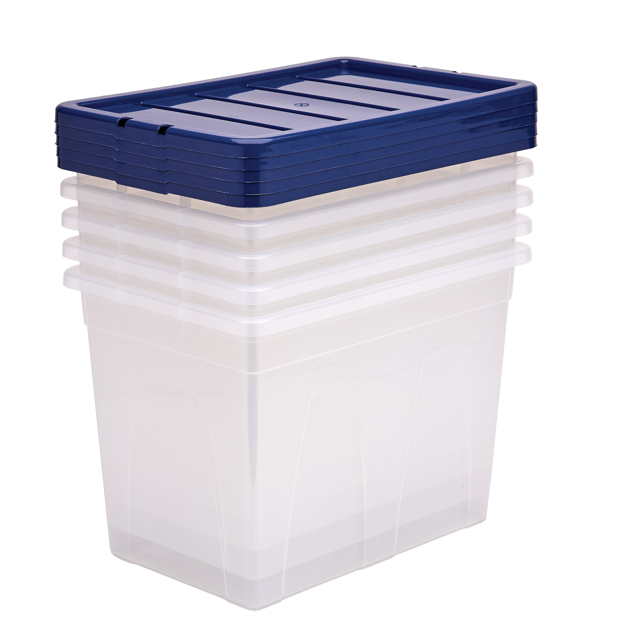 Contenitori multiuso trasparente con coperchio blu, per organizzare il tuo spazio di lavoro o personale. Progettati per annidarsi l'una nell'altra quando sono vuote o per impilarsi quando sono piene. Il coperchio antipolvere, realizzato al 100% con plastica riciclata post-consumo, protegge il contenuto e le chiusure a scatto lo mantengono in posizione. I contenitori sono realizzati in polipropilene 100% privo di BPAe completamente riciclabile.