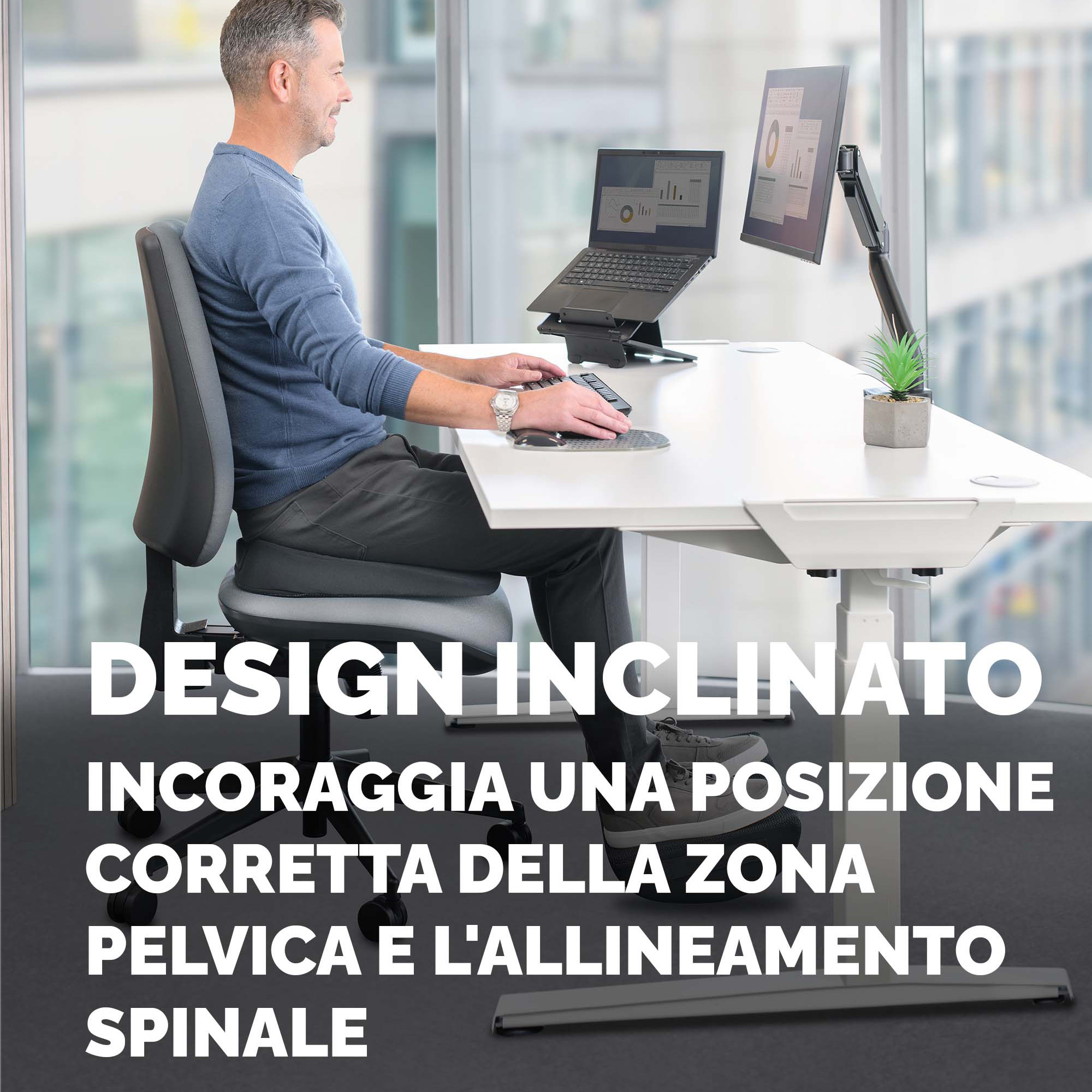 Il design a cuneo favorisce il corretto posizionamento pelvico e l'allineamento spinale per aiutare a ridurre il disagio alla schiena. Il discreto taglio per il coccige nascosto nella base aiuta ad alleviare la pressione alla base della colonna vertebrale. Maniglia di trasporto integrata per un facile trasporto ovunque tu lavori. Schiuma realizzata con il 93% di materiale riciclato pre-consumo, con conseguente riduzione dell'impatto ambientale rispetto a una schiuma vergine. Rivestimento in tessuto realizzato al 100% in poliestere riciclato post-consumo. Ergonomicamente testato da FIRA International come adatto allo scopo.Dimensioni: 9x43x43 cm