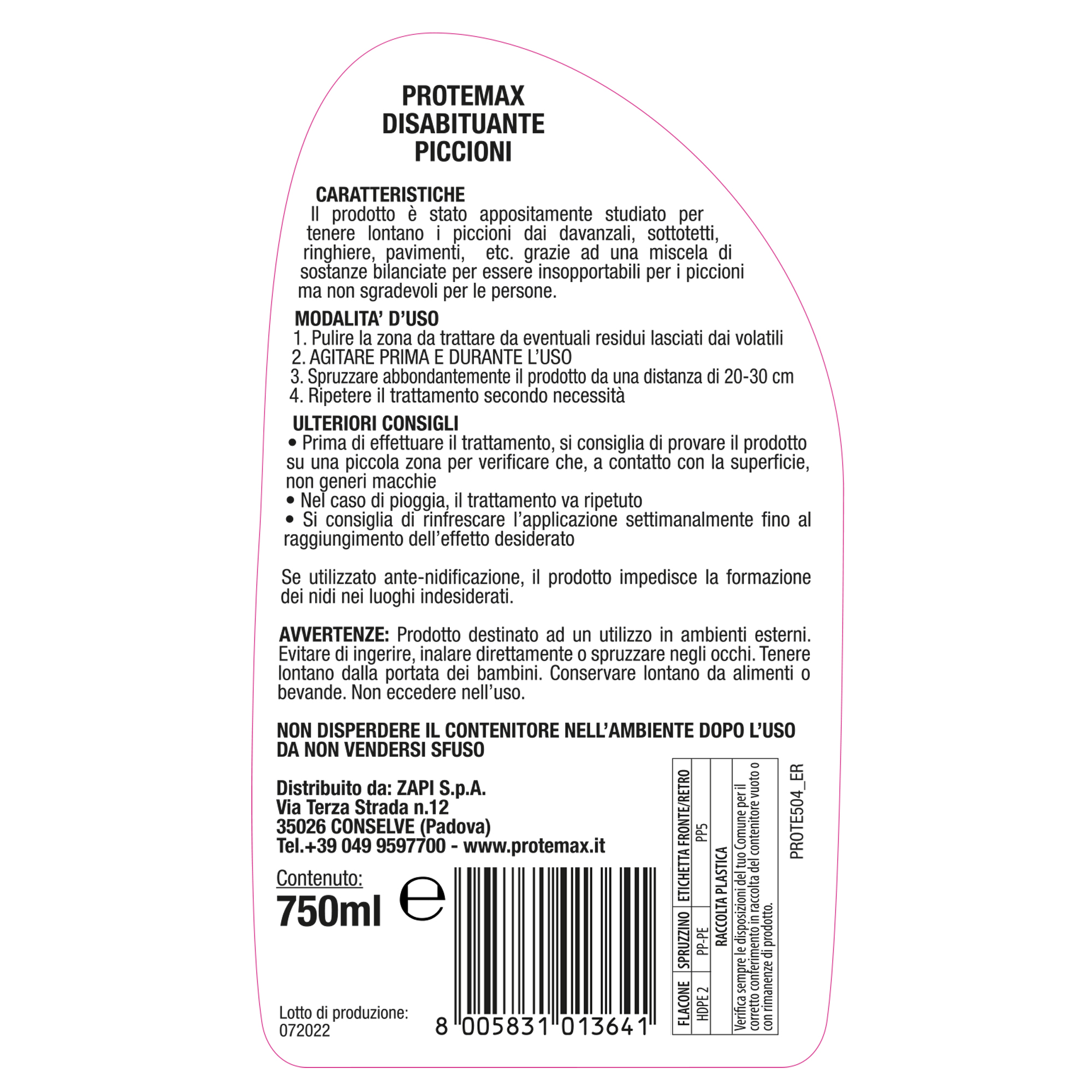 Prodotto in spray no gas pronto all’uso appositamente studiato per evitare che piccioni, colombi e altri volatili sporchino con le proprie deiezioni in luoghi indesiderati.Indicato per: davanzali, balconi, terrazzi, cornicioni, tetti ed altre aree esterne. Modalita’ d’uso: 1. Pulire, se possibile, la zona da trattare da eventuali residui lasciati dai volatili.2. AGITARE PRIMA E DURANTE L’USO 3. Spruzzare abbondantemente il prodotto da una distanza di 20-30 cm 4. Ripetere il trattamento secondo necessità.