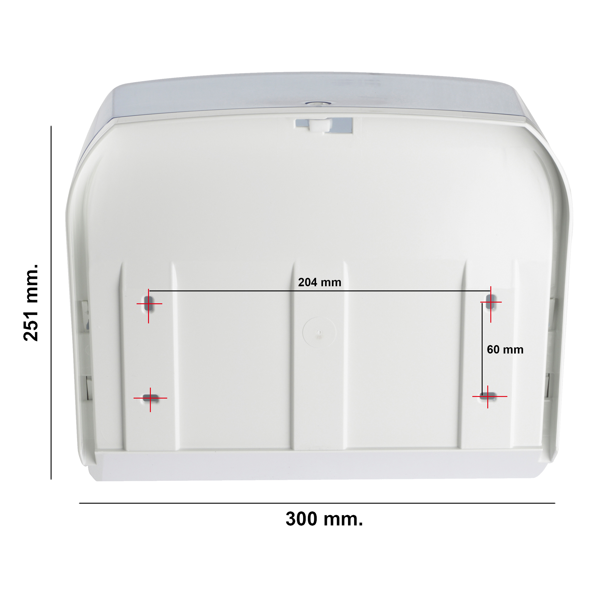 "Dispenser per asciugamani in carta. Puo' contenere sia il rotolo (dimensioni massime diametro 155mm h240mm) o i fogli intercalati piegati a ""C"" o a ""V"". Dimensioni dispenser: h251xp195xl300mm."