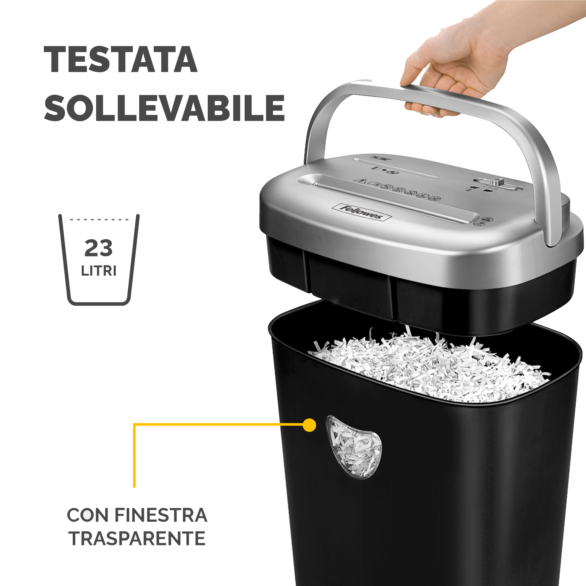 Distruggidocumenti per uso personale occasionale. Taglio a frammento: 4x35mm. Imboccatura: 220mm. Capacità di taglio 10 fogli da 70 gr / 9 fogli da 80 gr. Din: P-4. Cestino da 23 litri con testata facilmente sollevabile. Ciclo di lavoro: 3 on / 30 off. Livello rumorosità 70 -75 dB. Distrugge graffette, punti metallici, carte di credito e CD. Dimensioni 40 x 33,8 x 19,6cm. Peso 6,8Kg.