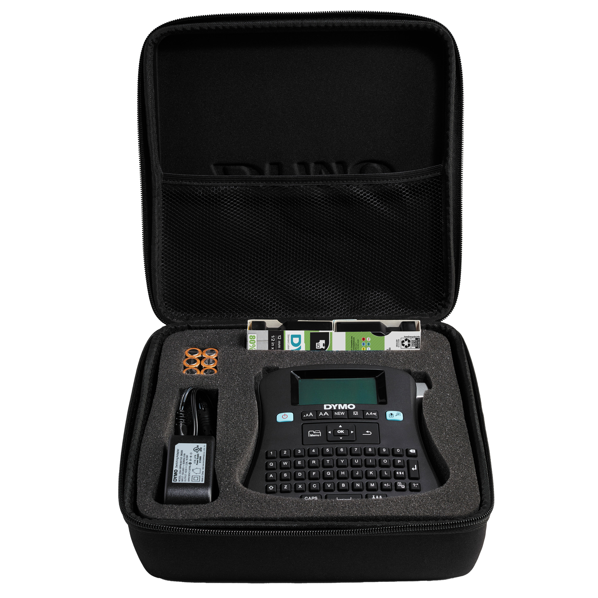 DYMO LabelManager 210D kit etichettatrice portatile, tastiera QWERTY,con custodia ed etichette D1 12 mm stampa nero su bianco. Il kit include: etichettatrice LM210D, 1 nastro per etichette D1: stampa nero su bianco, 12 mm x 7 m, 2 adattatori CA (EU e UK), guida di riferimento rapido e custodia. Digita e modifica il testo rapidamente grazie alla tastiera simile a quella del computer (QWERTY) e a un ampio display. Salva fino a 9 etichette, stampa fino a 10 copie di un'etichetta e crea etichette con caratteri in 6 dimensioni e 7 stili diversi oltre a 8 tipi di caselle differenti.Guida rapida. Alimentatore AC o adattatore opzionale (cod.37883) Garanzia limitata di 2 + 1 anno*.