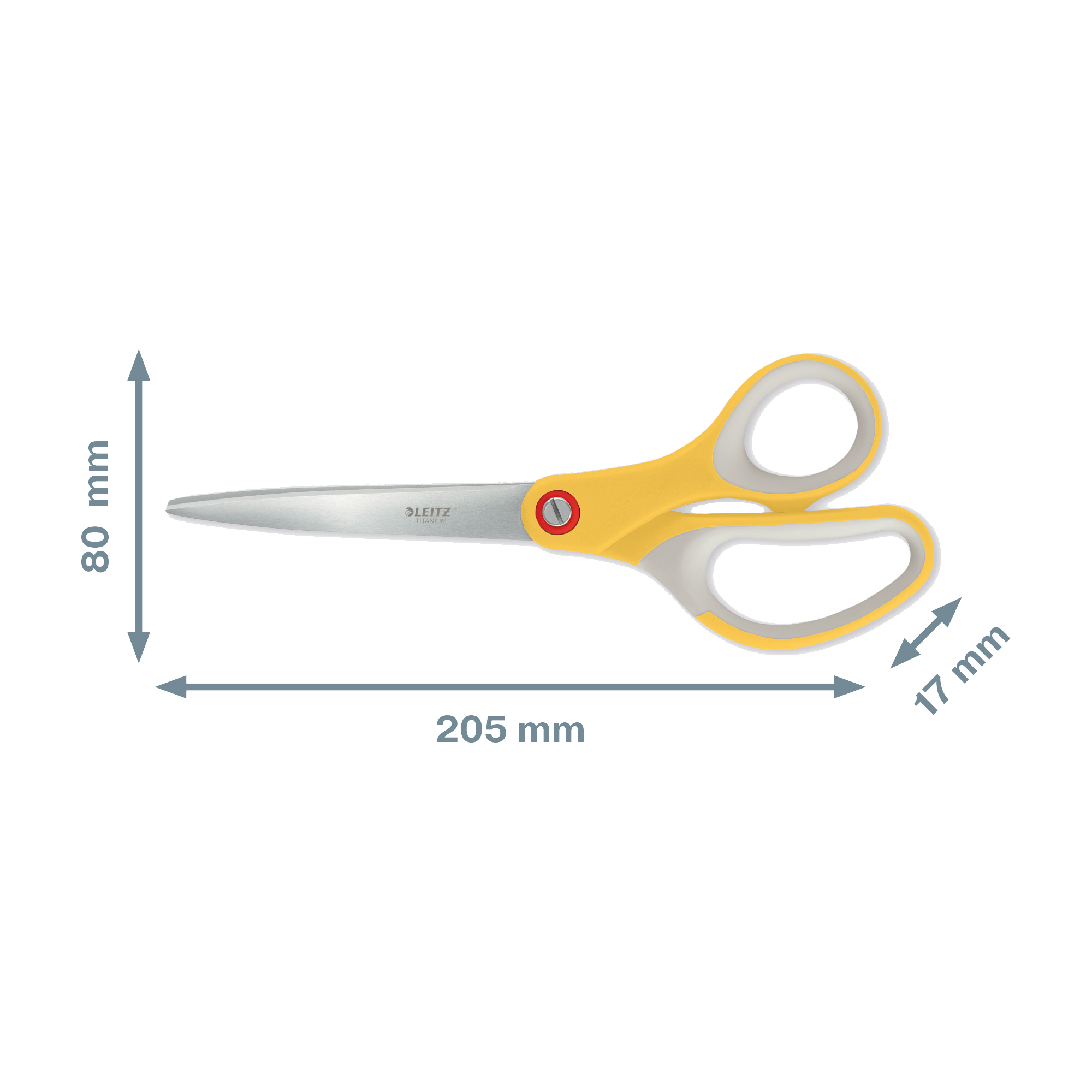 Forbici premium da 205 mm con impugnatura ergonomica. Acciaio inossidabile di alta qualità con lame rivestite in titanio. Invitante design a due colori.