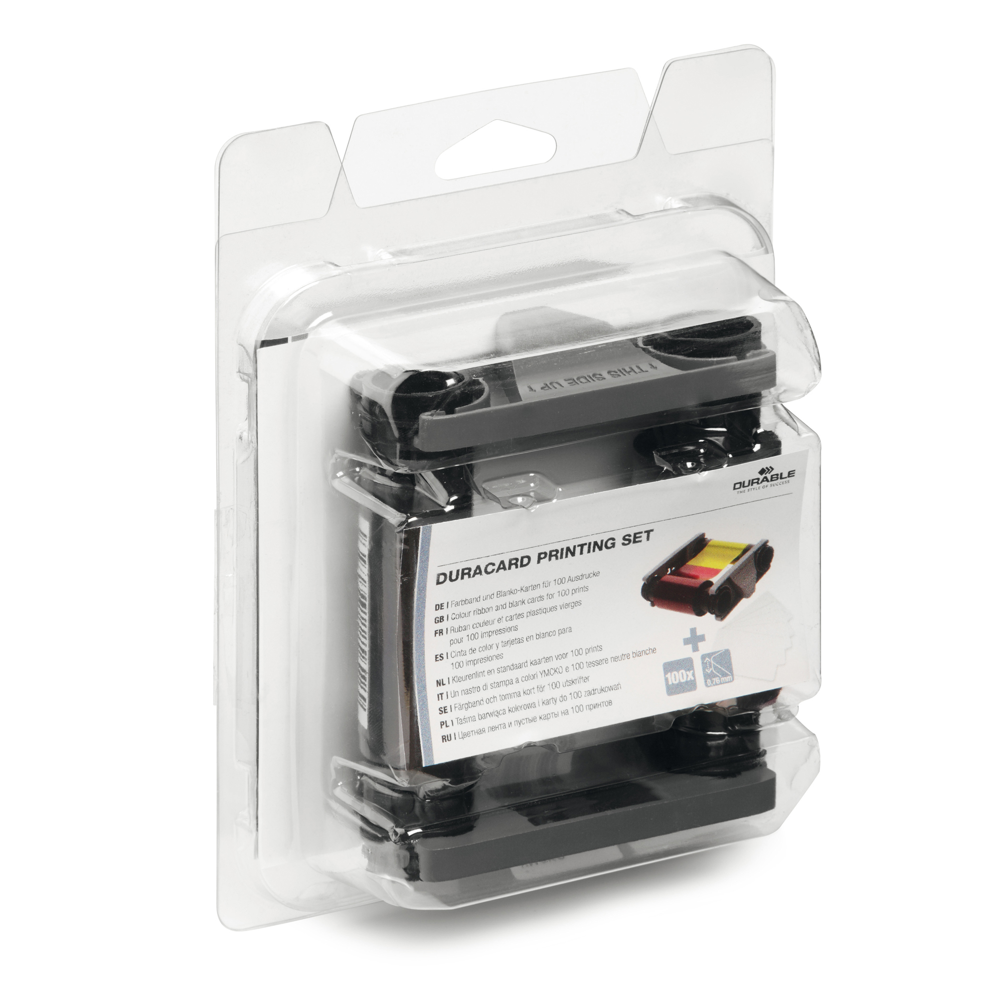 Kit inclusivo di nastro di stampa a quattro colori YMCKO dotato di un extra strato trasparente di protezione adatto alla personalizzazione di 100 tessere di plastica in qualità fotografica e 100 tessere con spessore di 0,76 mm. Il blocco nastro è dotato di tecnologia di codifica RFID per garantire un veloce riconoscimento dei nastri originali per la stampa da parte della stampante DURACARD ID 300. L'uso di nastri originali DURABLE garantisce la migliore qualità di stampa ed una maggior protezione della testina di stampa. Inoltre, il formato compatto dei nastri ne agevolano il ricambio.