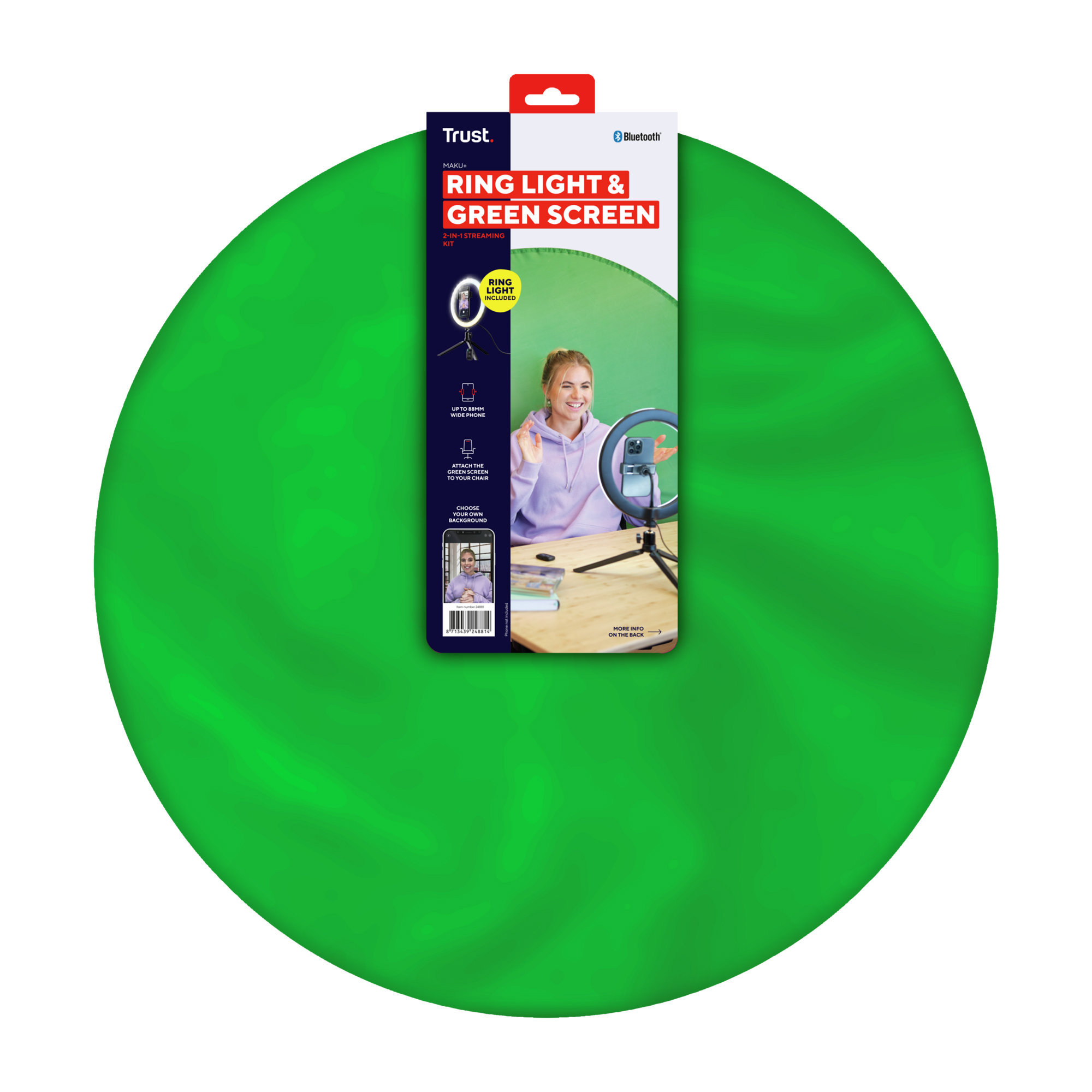 scegliere un qualsiasi sfondo con te al centro - Il green screen può essere agganciato alla maggior parte delle sedie tramite fasce in velcro - Anello luminoso LED da 10" che proietta sul volto una luce graziosa - Il telecomando integrato permette di regolare la luminosità e la temperatura del colore - Compatibile con telefoni, fotocamere e webcam per iniziare subito a trasmettere - Include il controller Bluetooth®, per il controllo in wireless dell'otturatore del telefono - Alimentazione USB, compatibile con qualsiasi caricabatterie per telefono o powerbank (non forniti in dotazione)