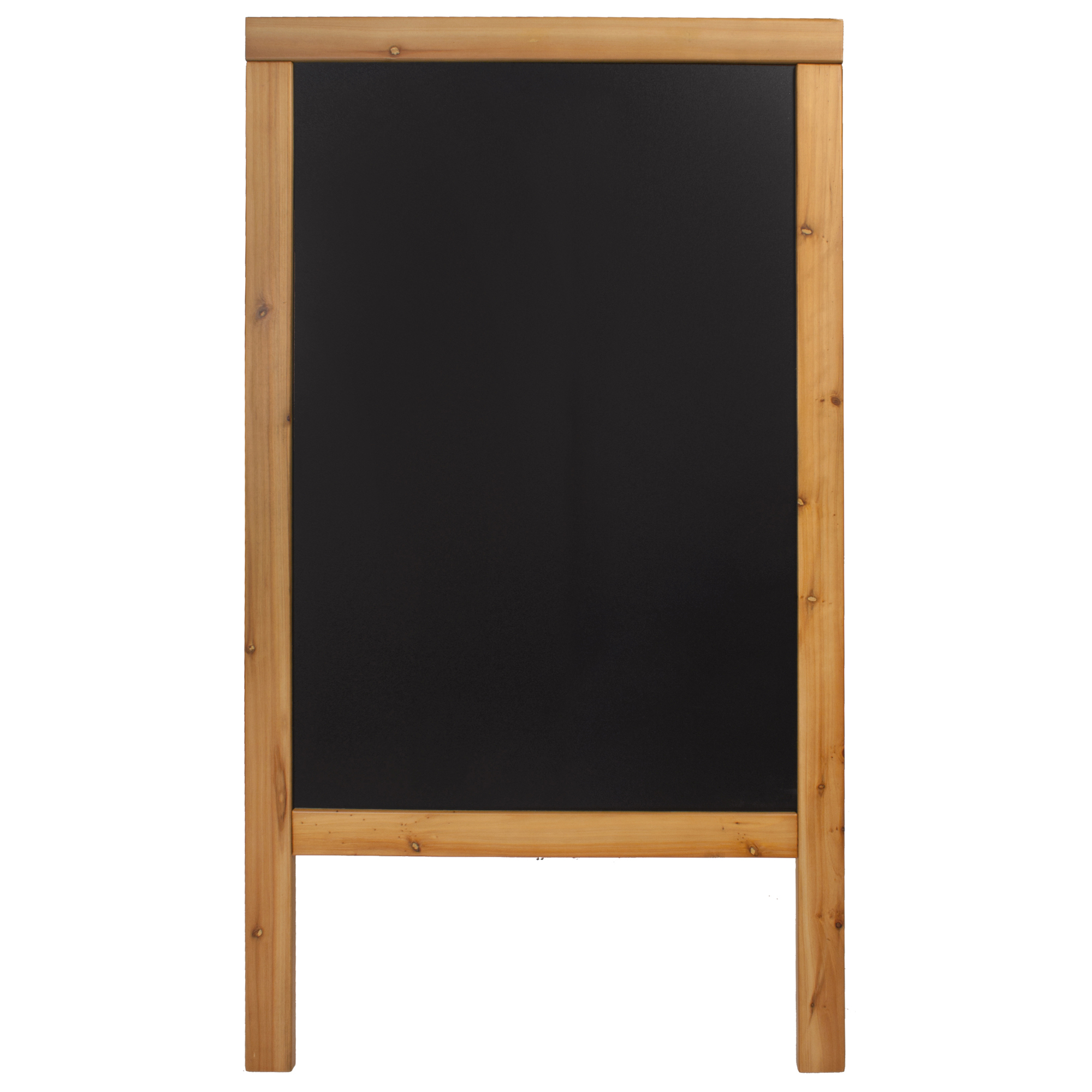 Lavagna nera da terra a cavalletto con doppia faccia. Cornice in legno duro con tripla laccatura che la rende idonea all'utilizzo anche in esterno. Superficie scrivibile con pennarelli a gesso liquido, antigraffio, resistente ai raggi uv e alle deformazioni dovute al calore.