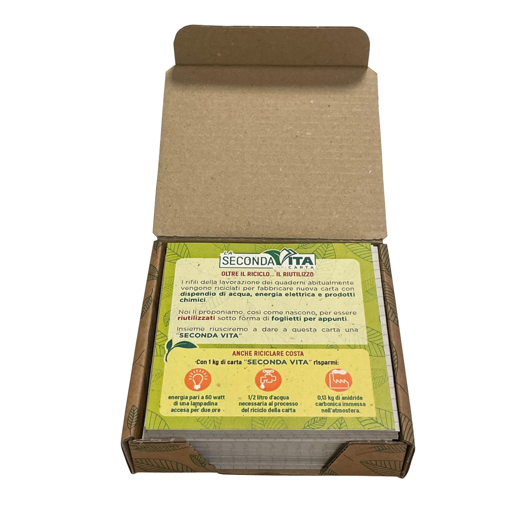 Maxiquaderno spiralato. Formato 22,2x29,7cm. Carta riciclata da 80 gr/mq. Copertina stampata quadricromia in cartoncino da 340 gr/mq. Cartoncino di rinforzo bianco/bianco da 840 gr/mq. Spirale wire-o. Prodotto totalmente in carta riciclata - Totalmente privo di plastica - 100% riciclabile. 80 fogli (160 facciate scrivibili). Confezione in cartone privo di plastica contenente 6 maxiquaderni spiralati rigatura 1rigo + 6 scatoline di foglietti per appunti Seconda Vita in omaggio (carta proveniente da rifili di lavorazione). Una linea di prodotti ecologici ad altissima grado di sostenibilità. Prodotti con energia solare.