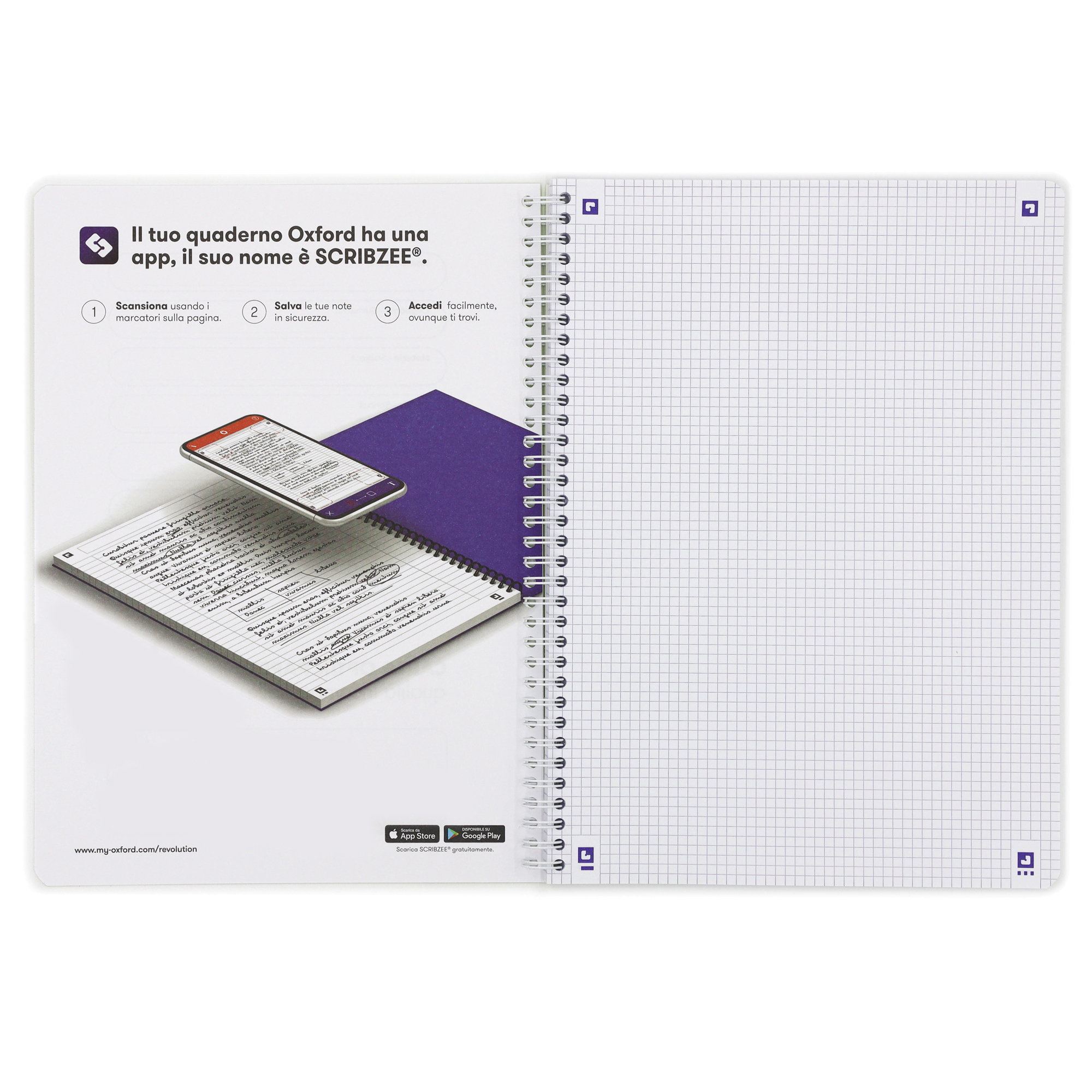 Maxi spiralato A4+ con copertina in cartoncino flessibile in 5 colori fluo: fucsia, verde, arancio, giallo e azzurro. Spirale di colore bianco. 120 pagine con microperforazione e 4 fori, rigatura 4mm, 5mm e 1R. Carta Optik Paper® da 90 g., bianchissima, liscia, satinata e resistente agli strappi; l'inchiostro non attraversa la pagina. Speciali marcatori agli angoli delle pagine da utilizzare con l'App SCRIBZEE®.