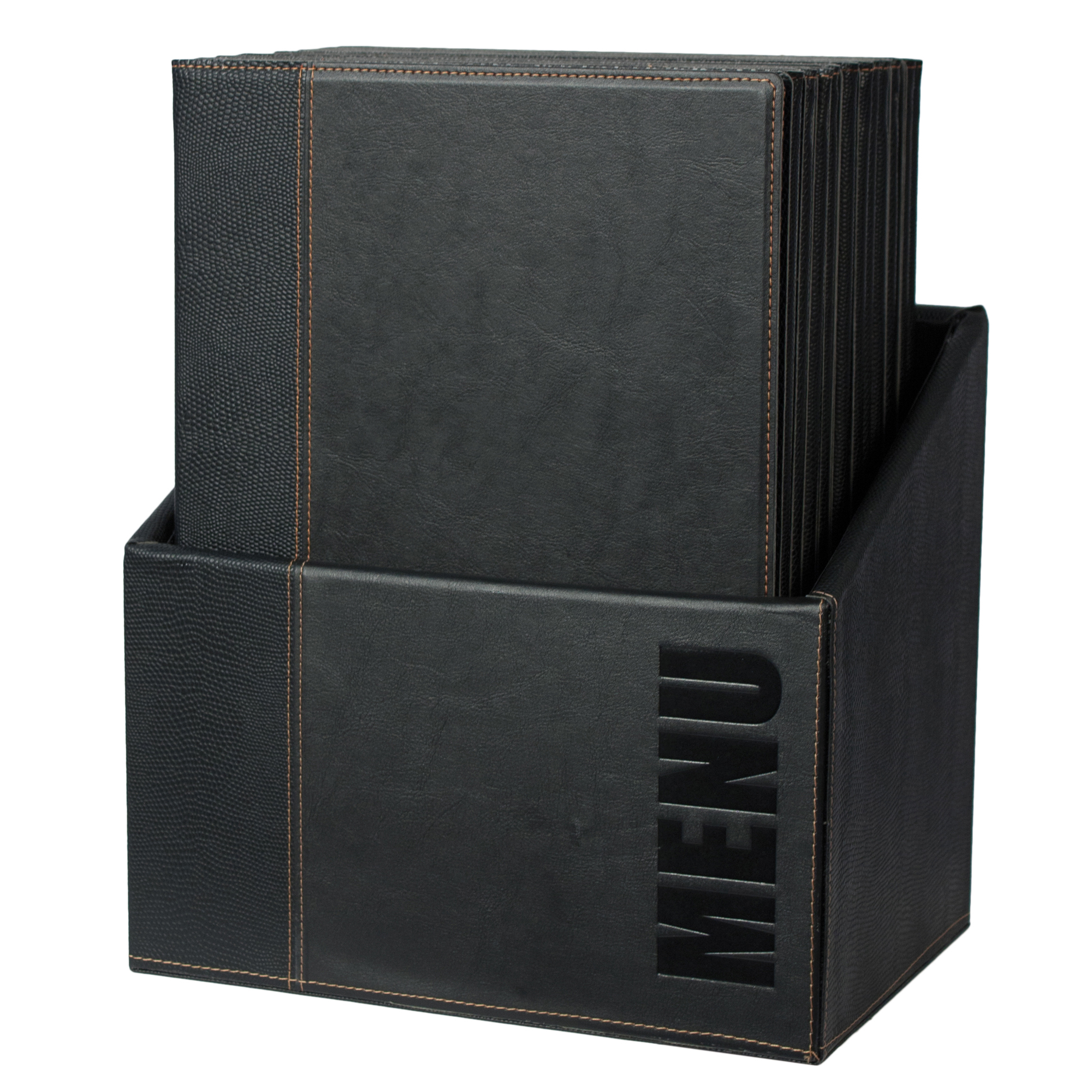 Scatola contenitore in similpelle con 20 porta menù a 4 linea Trendy (ad 1 inserto). Soluzione ideale per tenere i menù sempre in ordine e pronti all'uso! Dimensioni: 37 x 29 x 21cm. Può contenere fino a 10 inserti doppi per un totale di 40 facciate.