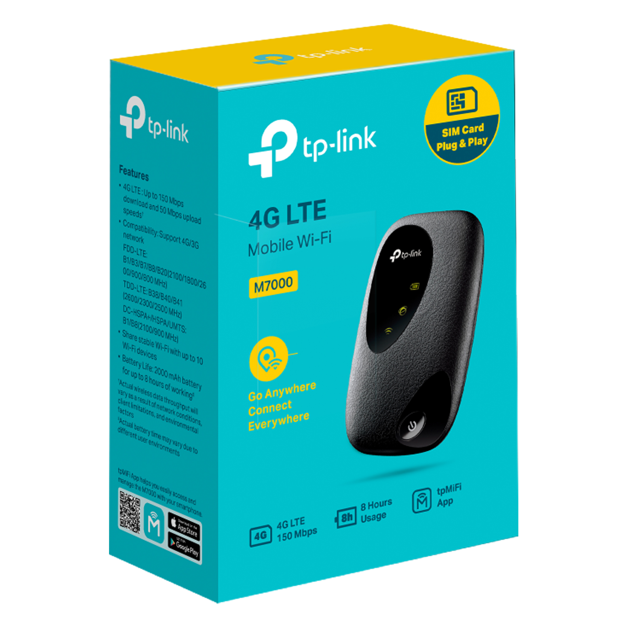 M7010 è un hotspot Wi-Fi che supporta lo standard 4G FDD/TDD-LTE, compatibile con la maggior parte degli operatori nel mondo, ideale per chi è sempre in movimento. Basta inserire una SIM Card per creare una rete wireless stabile e performante sulla rete 4G e essere subito pronto a connetterti. Porta M7010 con te ovunque per navigare senza interruzioni, goderti film in streaming o effettuare video chiamate senza fastidiosi lag. Rete 4G - Velocità di download fino a 150 Mbps. Velocità Wi-Fi - Fino a 300Mbps.* Batteria 2000mAh - Autonomia fino a 8 ore di utilizzo.* Condividi la connessione - M7010 supporta fino a 10 dispositivi connessi in contemporanea. Massima compatibilità - Supporta lo standard Wi-Fi 4G FDD/TDD-LTE, compatibile con la maggior parte degli operatori nel mondo. Gestione intuitiva - L'app tpMiFi consente di gestire la rete in modo semplice e rapido.