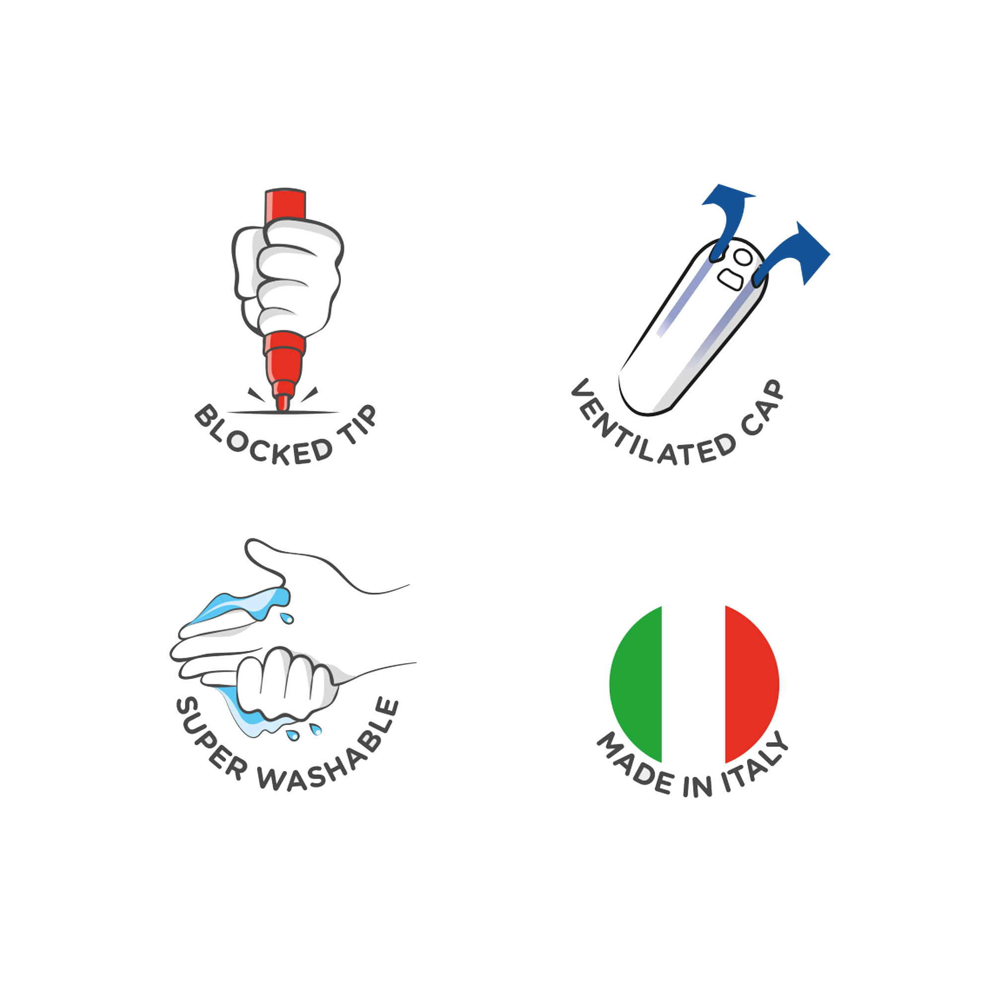 IL PENNARELLO CLASSICO DELLA LINEA CARIOCA CON PUNTA FINE PER UN TRATTO PRECISO. INCHIOSTRO SUPERLAVABILE ATOSSICO, LAVABILE DALLA PELLE CON ACQUA ANCHE SENZA SAPONE.