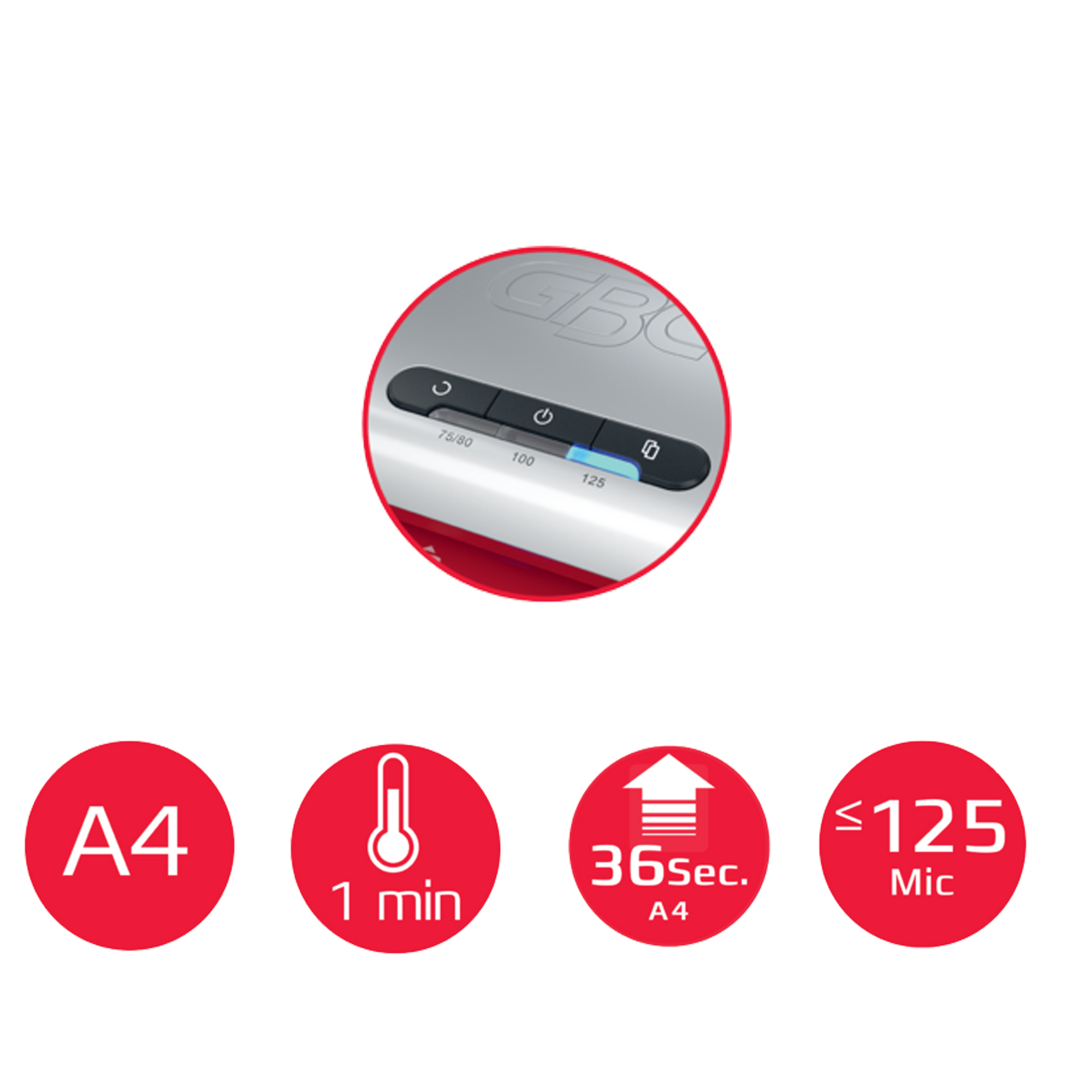 La plastificatrice GBC 250 A4 rappresenta una soluzione affidabile ed efficiente per le esigenze quotidiane di plastificazione in ufficio. Progettata per ambienti professionali, questa plastificatrice combina prestazioni e facilità d'uso. Con un rapido tempo di riscaldamento di 1 minuto, plastifica un foglio A4 da 75 micron in soli 36 secondi, rendendolo ideale per le attività d'ufficio a ritmo sostenuto. Il pannello di controllo intuitivo offre tre impostazioni di spessore della pouches da 75 a 125 micron, garantendo flessibilità per vari tipi di documenti. Il pannello è inoltre dotato di un pulsante di inversione anti-inceppamento per una rimozione agevole delle pouches errate. Inoltre, il sistema di LED di stato SMART fornisce chiari segnali visivi e acustici: rosso durante il riscaldamento, blu con un suono quando è pronto e spegnimento automatico dopo 15 minuti di inattività per il risparmio energetico. I LED della guida d'ingresso SMART assicurano l'allineamento rettilineo della pouches per evitare inceppamenti, rendendo perfetta ogni plastificazione. Proteggi e conserva i tuoi documenti importanti con velocità e con una finitura liscia e professionale ogni volta. Colore nero e rosso. Plastifica 16 x A4 in 10 minuti. Il pannello di controllo è dotato di un pulsante di inversione anti-inceppamento. Include una confezione iniziale di 5x pouches A4 (75 micron). Basso livello di rumore <(><<)>50Dba per ridurre le distrazioni. Certificato CE, TUV/GS.