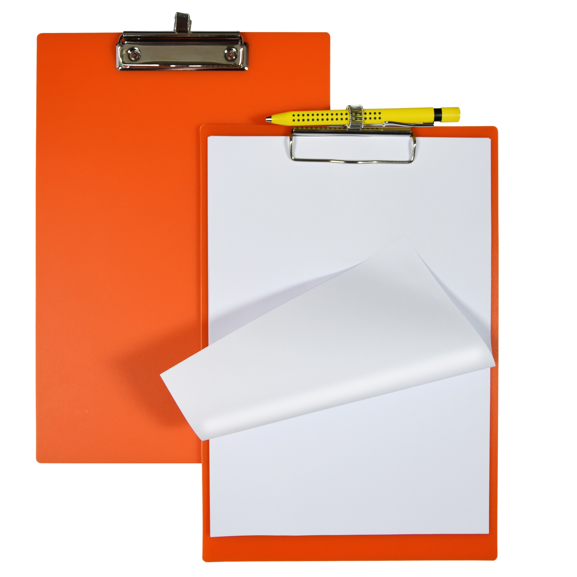 Porta blocco semplice in PP opaco riciclato e riciclabile. Con molla in acciaio dotata di portapenna estendibile. Disponibile in 4 colori assortiti: azzurro,arancione, verde e rosso.