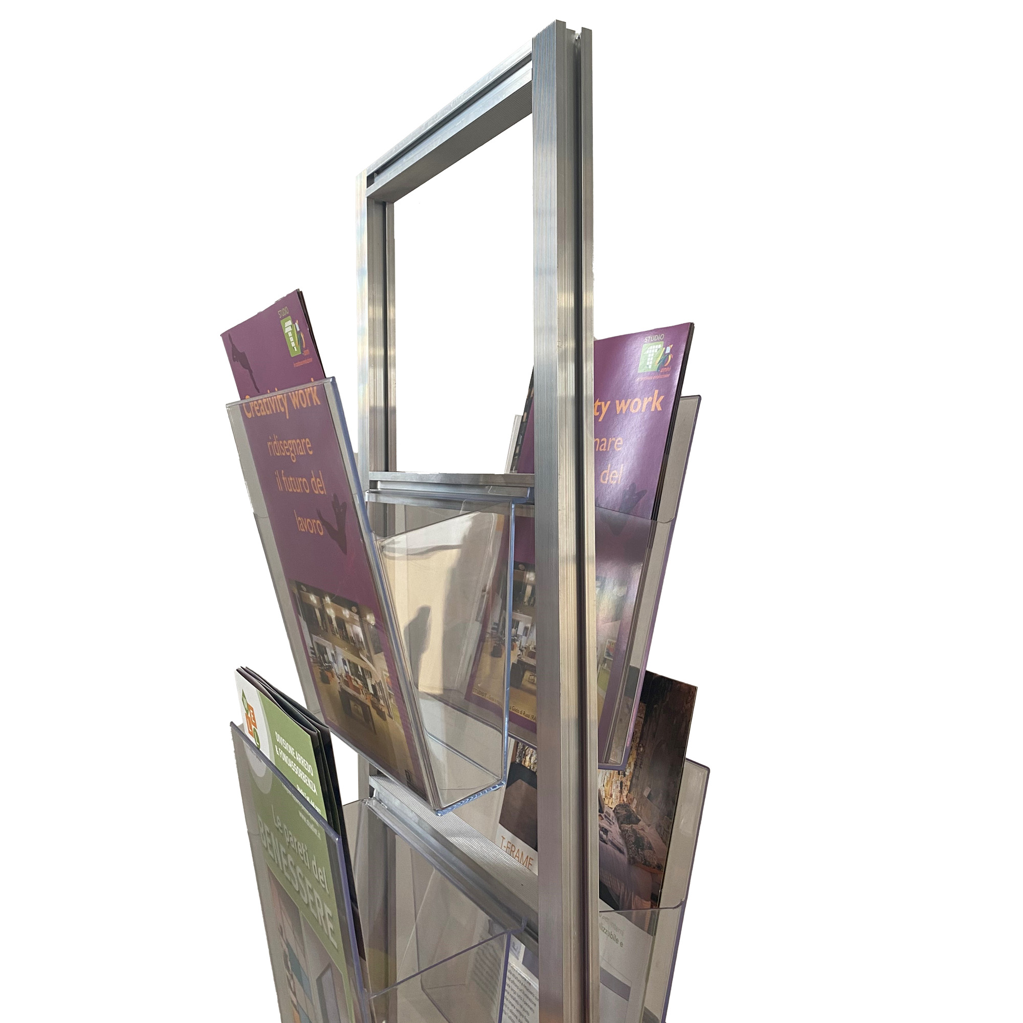 Espositore porta depliant. Montanti in alluminio e tasca Vision molto contenitiva formato A4 comodo.