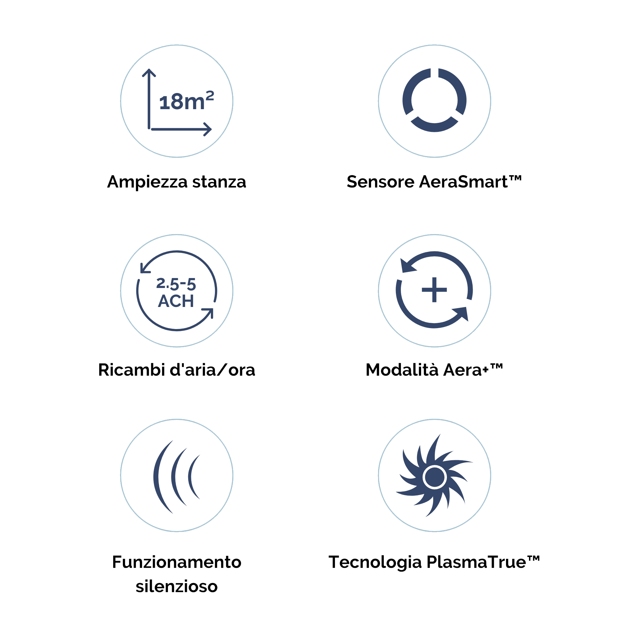 Purificatore d’aria per ambienti fino a 20m2. Processo di purificazione dell’aria in 4 stadi che rimuove il 99,97% di tutti gli agenti inquinanti dell’aria fino alla dimensione di 0,3my: germi, virus, sostanze chimiche, odori, fumo, polveri sottili, pollini, allergeni. Due sistemi di filtraggio (filtro a carbone per rimuovere odori e sostanze chimiche; filtro HEPA VERO per particelle ed impurità) con trattamento antimicrobico AeraSafeTM per la riduzione della proliferazione di batteri sui filtri. Tecnologia PlasmaTrueTM che crea un campo ionizzato in grado di abbattere gli altri agenti inquinanti a livello molecolare. Modalità Aera+ aumenta la potenza del 35% per i periodi di maggiore incidenza delle allergie. Sensore AutoSmart: l’unità riconosce il livello di impurità dell’aria e regola la velocità della ventola. Pannello di controllo user friendly che avvisa quando è il momento di sostituire i filtri e mostra il livello di inquinamento dell’aria. Basso consumo energetico e grande silenziosità. CADR (velocità di purificazione d'aria): 129 (polvere), 126 (fumo), 124 (pollini). Filtro carbone ricambio (9324101): durata 3 mesi. Filtro Hepa ricambio (9287101) : durata 1 anno. Dimensioni: 45,4x29,4x14,4cm. Peso: 5,1kg.