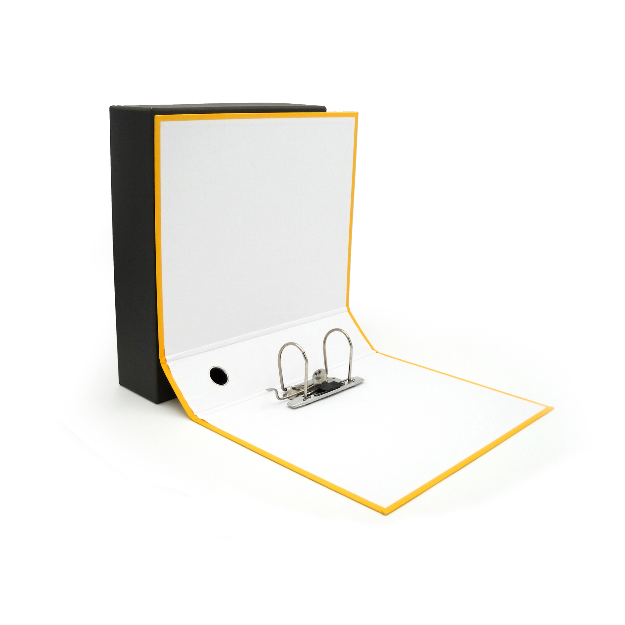 Registratore STARLINE modello StarBox, con struttura in cartone rivestita in carta goffrata stampata e risguardo bianco. Dotato di meccanismo a leva in acciaio nichelato con pressino. Custodia in fibrone nero rivestita in carta usomano. Anello di estrazione in metallo.