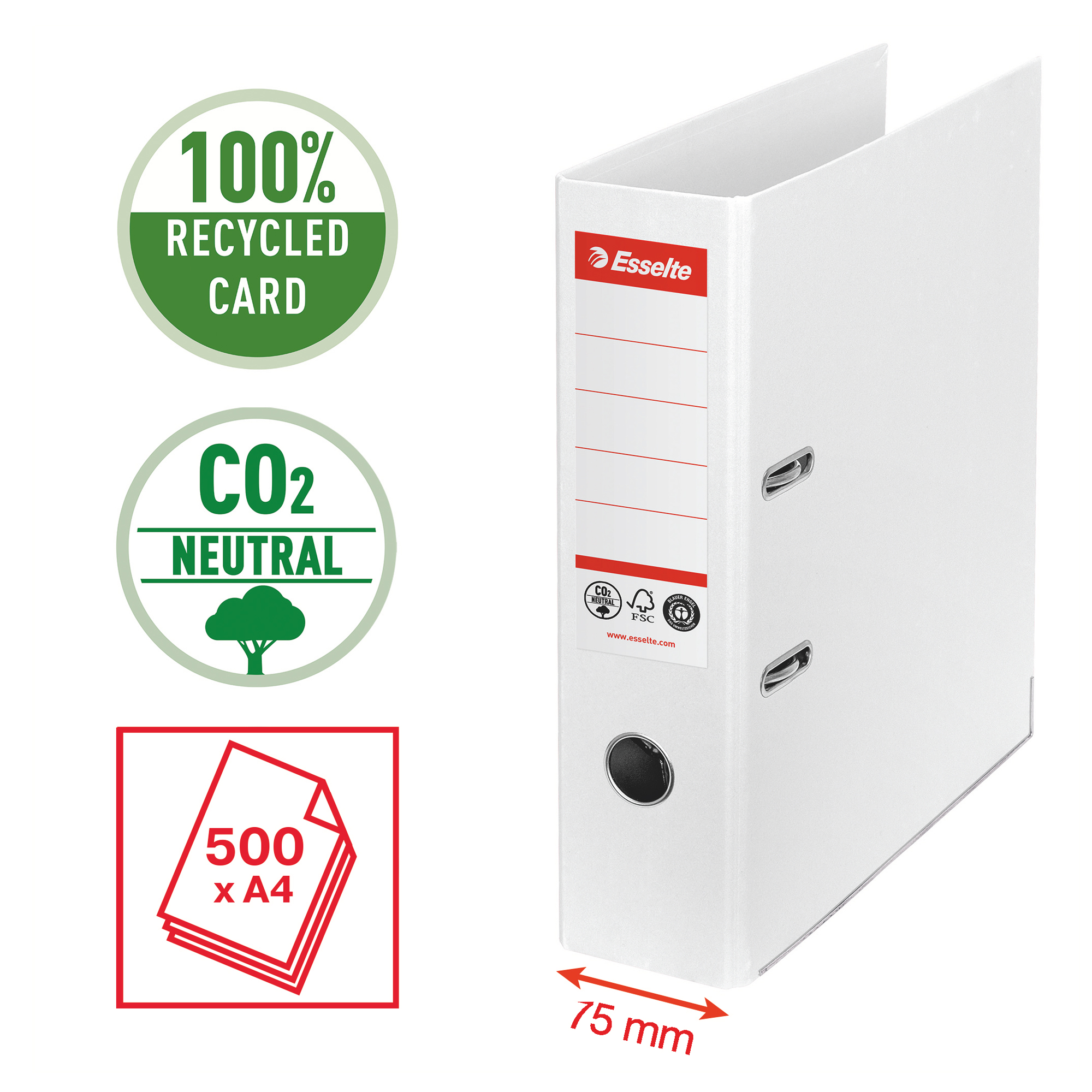 Info sui prodotti "Registratore a leva - CO2 neutral - A4 - dorso 75 mm - bianco - Esselte"