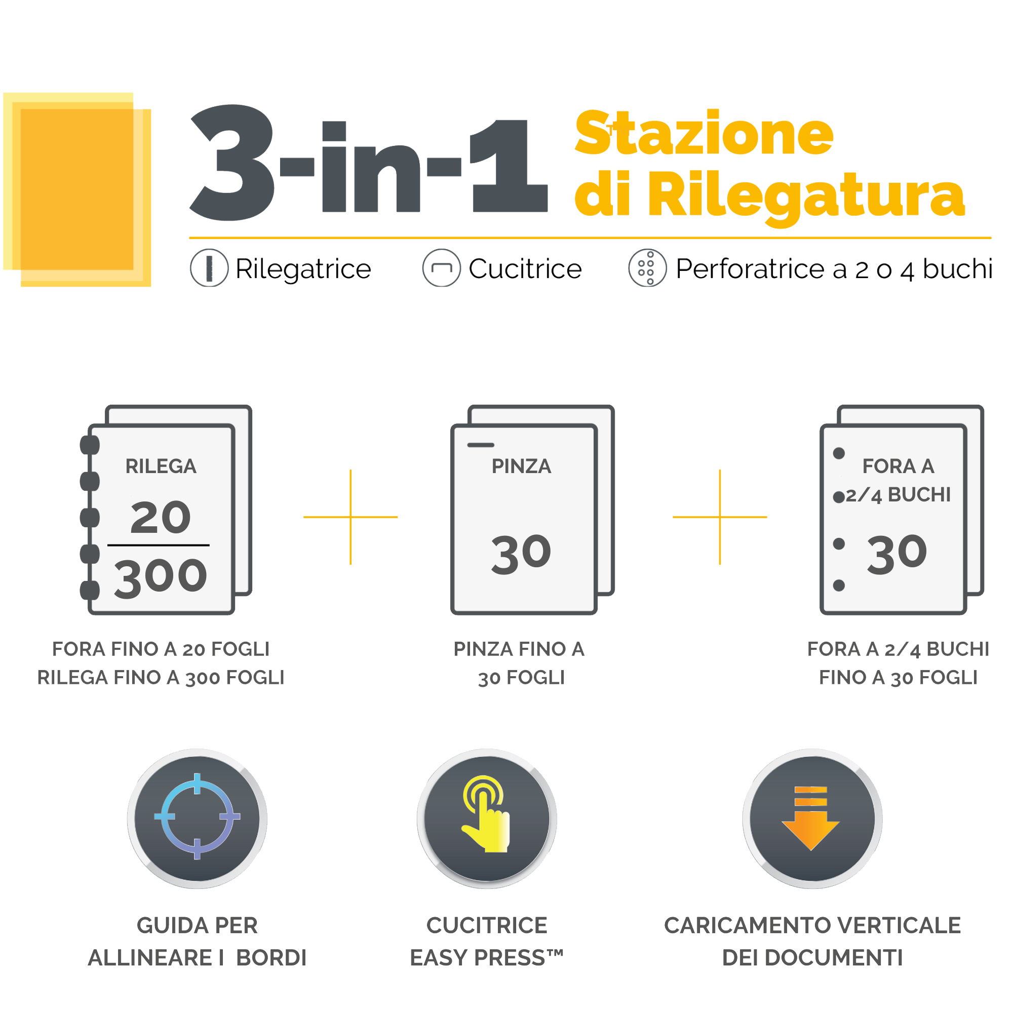Questo centro di rilegatura 3 in 1 permette di rilegare, pinzare e perforare documenti, tutto con una sola macchina. Rilega a dorsi plastici documenti fino a 300 pagine, con una capacità di perforazione manuale di 20 fogli e dorsi dei diametro max di 38mm. Cucitrice EasyPress™ per pinzare facilmente fino a 30 fogli. Compatibile con punti metallici 24/6 e 26/6. Allineamento perfetto per perforare e pinzare in maniera accurata. Caricamento veloce per rilegare in modo rapido ed accurato grazie al caricamento verticale. Perforazione a 2 o 4 fori con comodo selettore, fino a 30 fogli contemporaneamente. 2 anni di garanzia e kit iniziale di 1000 punti metallici.