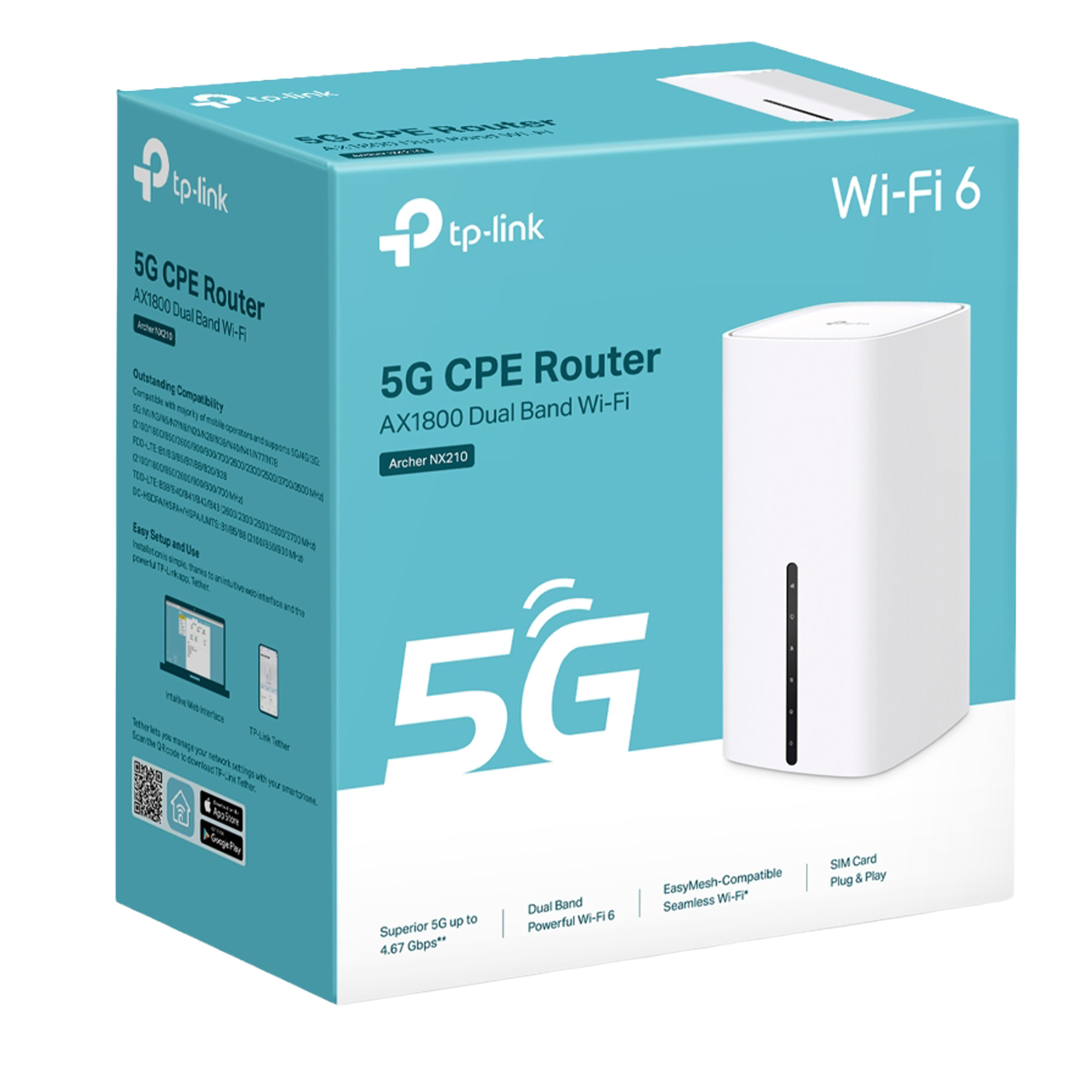 Grazie alla tecnologia 5G NX210 può supportare velocità di download fino a 4.67Gbps per soddisfare le esigenze di connessione di numerosi dispositivi Wi-Fi. Grazie alle tecnologie dello standard Wi-Fi 6, NX210 è progettato per offrire alte performance in termini di copertura, velocità e capacità totale. Supporto connettività 5G - Connetti la tua casa sfruttando connettività 5G avanzata con velocità di download fino a 4,6 Gbps e condividi la rete con più dispositivi Wi-Fi. Wi-Fi 6 AX1800 - Fino a 1201Mbps (5GHz) + 574Mbps (2.4GHz). Plug <(>&<)> Play - Inserisci una SIM Card e sei subito pronto a connetterti. Supporto EasyMesh - Espandi Wi-Fi aggiungendo un extender compatibile con EasyMesh e goditi una rete senza interruzioni di segnale. Porta Gigabit WAN/LAN - La porta WAN/LAN gigabit consente a NX200 di funzionare come un router wireless tradizionale compatibile con modem via cavo, fibra e DSL.