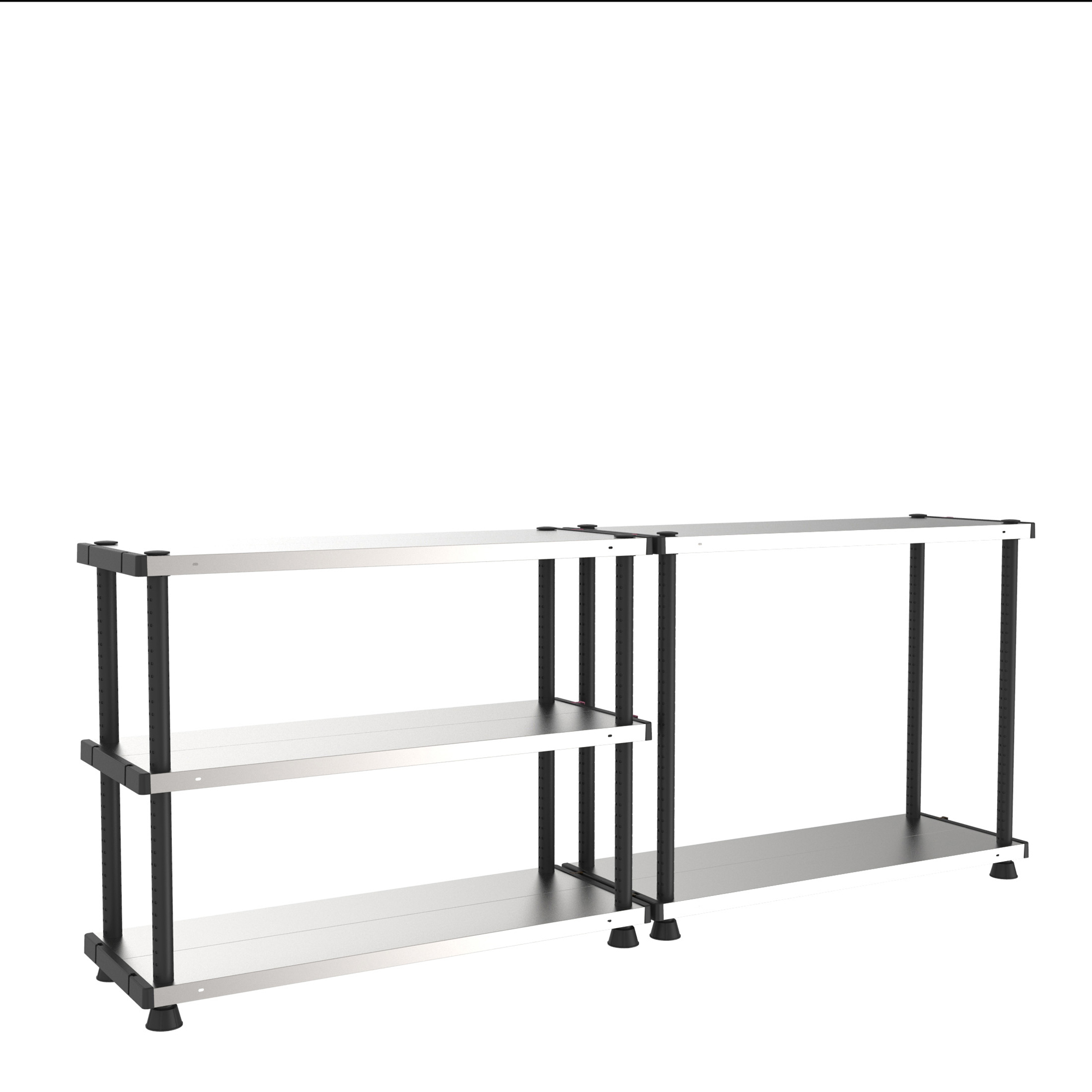 Scaffale composto da 4 montanti verticali in plastica nera con piedini regolabili in altezza. 5 ripiani in metallo regolabili con profondità di 45cm con portata massima di 120Kg per ripiano. Montaggio dello scaffale stimato in 10". Possibilità di fissaggio a parete.