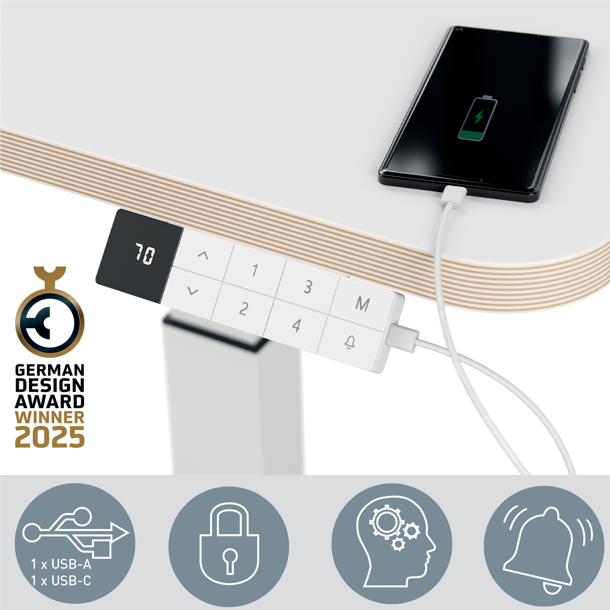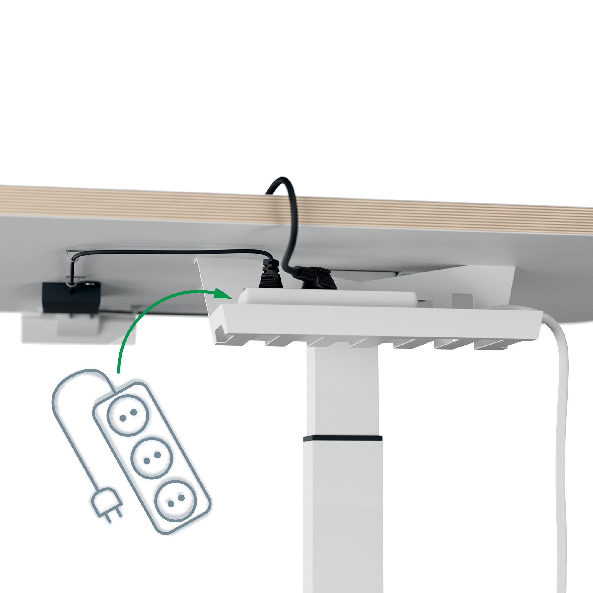 La scrivania è progettata per un uso flessibile e come spazio di lavoro temporaneo, perfetto per l'home office e le aree di hot desking con funzione di memoria per regolare rapidamente 4 impostazioni di altezza preimpostate. 80 x 60 x 2,5 cm di scrivania con un carico massimo di 80 kg per contenere un monitor e un computer portatile con supporto, tastiera, mouse e poggiapolsi. Regolazione elettrica dell'altezza da 65 a 130 cm per adattarsi a tutte le esigenze, motore fluido con un discreto livello di rumore <(><<)>25db, protezione contro il surriscaldamento e funzione anticollisione. Pad di controllo di facile utilizzo con blocco per bambini, porte USB-C <(>&<)> USB Ada 5 V e schermo per la visualizzazione dell'altezza Include un vassoio per cavi che può essere fissato sotto la scrivania per contenere una presa di corrente e 4 clip autoadesive trasparenti per ridurre i grovigli di cavi