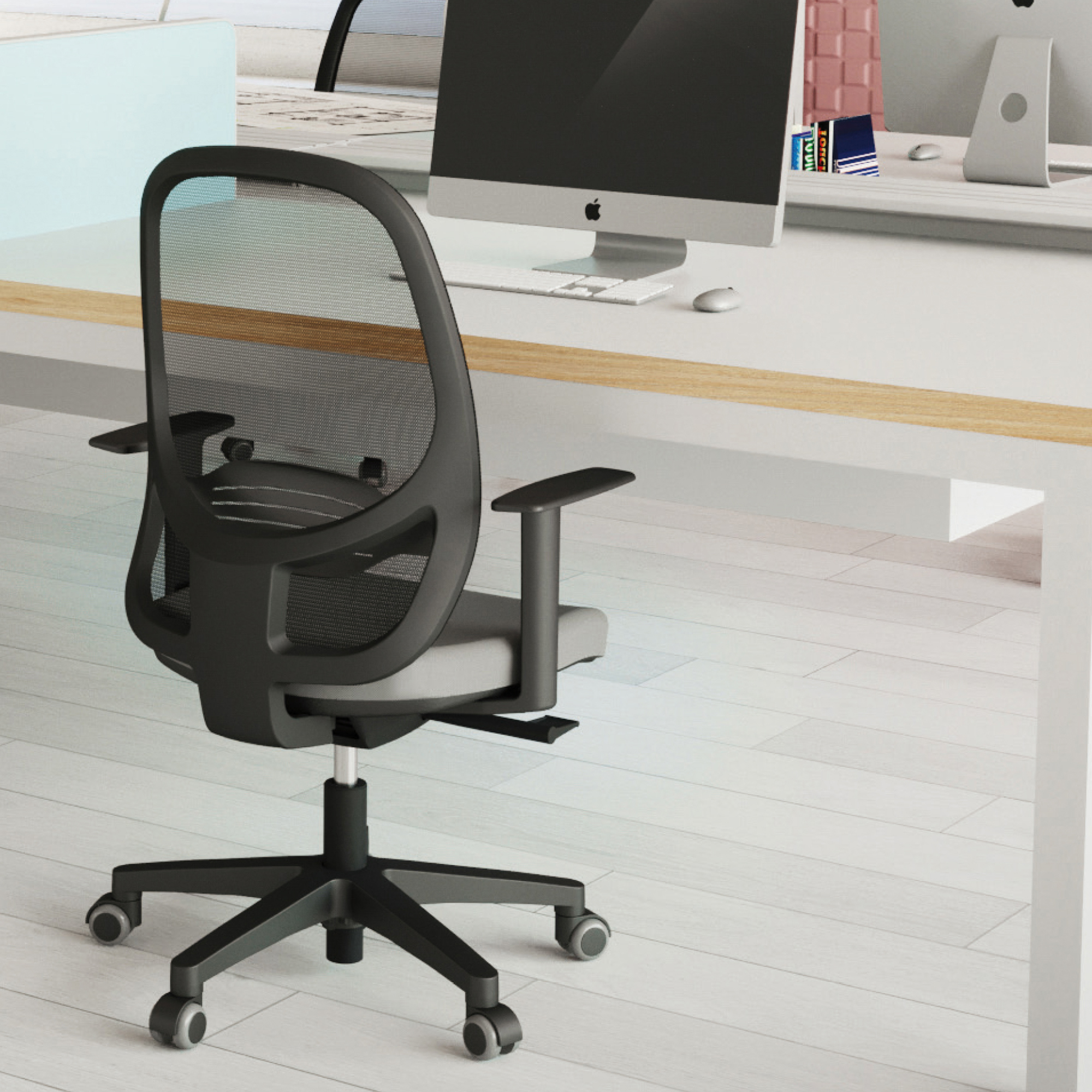 Seduta ergonomica adatta per uso intenso. Schienale in rete nera con supporto lombare regolabile. Meccanismo synchro con 4 blocchi antishock, traslatore e variatore di forza a contatto permanente. Braccioli regolabili. Elevazione a gas.