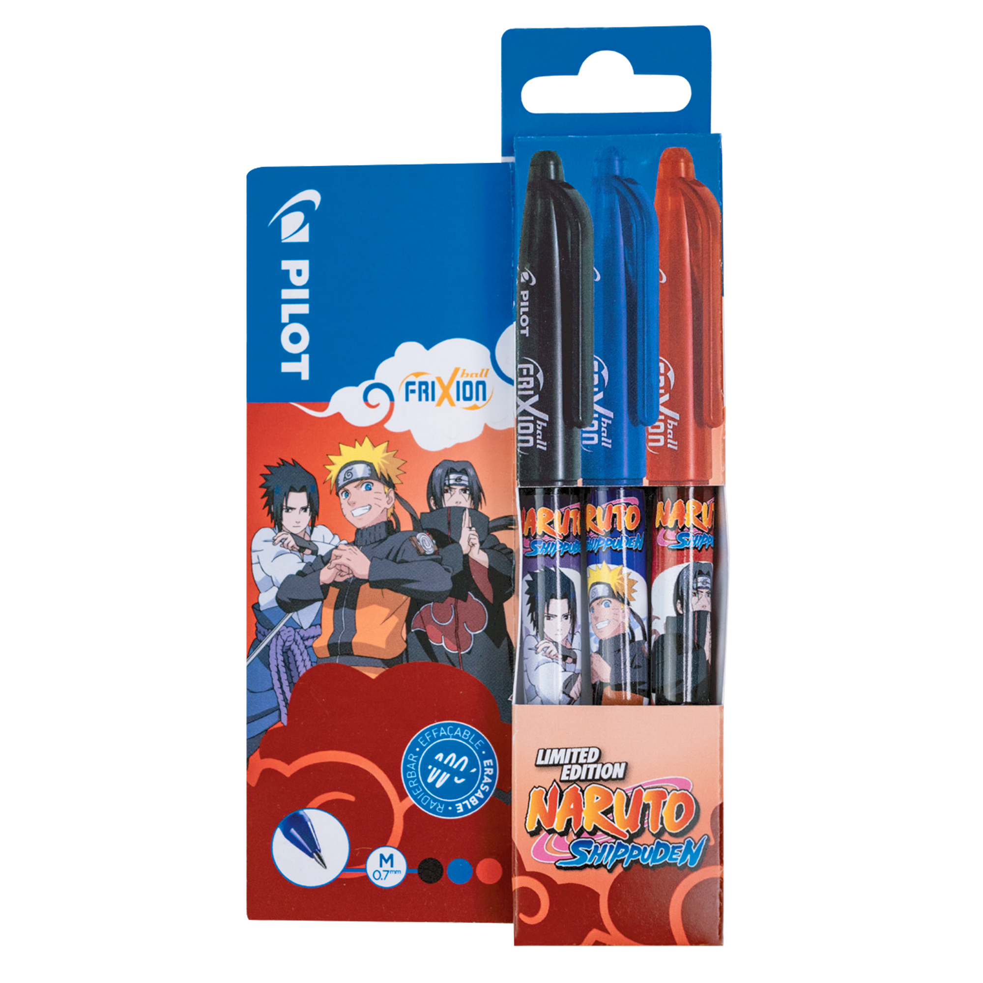 Modulo espositivo appendibile con 6 set da 3 penne cancellabili Frixion Ball e 6 set da 3 penne Frixion Ball Clicker, edizione limitata Naruta. Punta 0.7mm, colori assortiti: nero/rosso/blu.