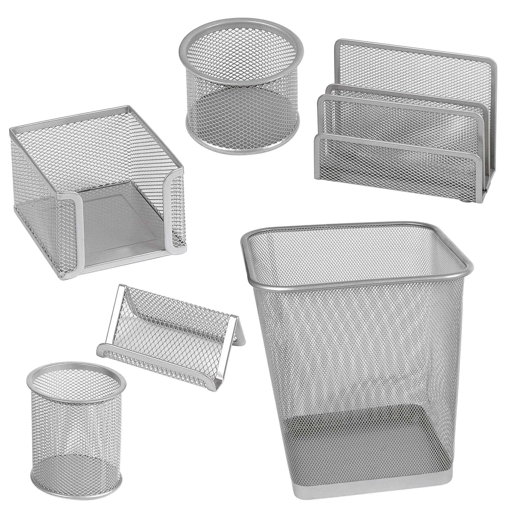 Set scrivania in rete metallica, composto da 6 accessori: sparticarte, cubo portamemo, portapenne, portafermagli, portabiglietti da visita e cestino gettacarte.