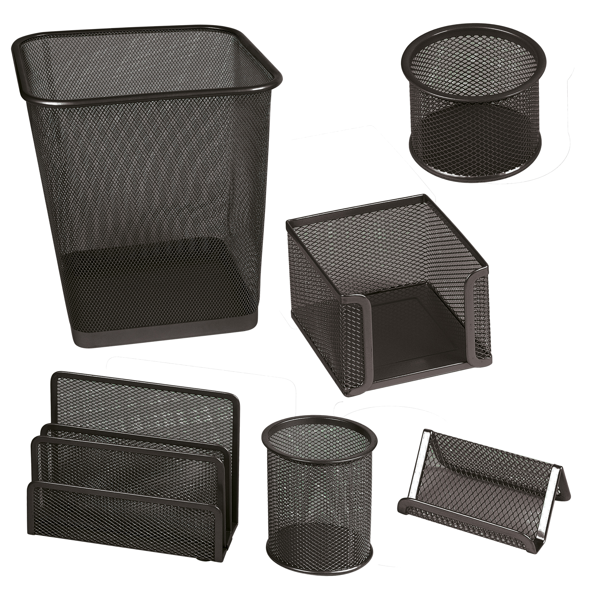 Set scrivania in rete metallica, composto da 6 accessori: sparticarte, cubo portamemo, portapenne, portafermagli, portabiglietti da visita e cestino gettacarte.
